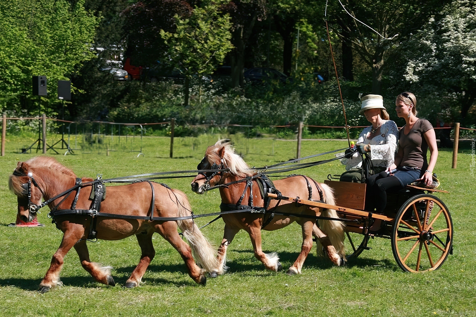 Edytor tapety: Dwa, Kucyki, Bryczka, Kobiety, Zieleń