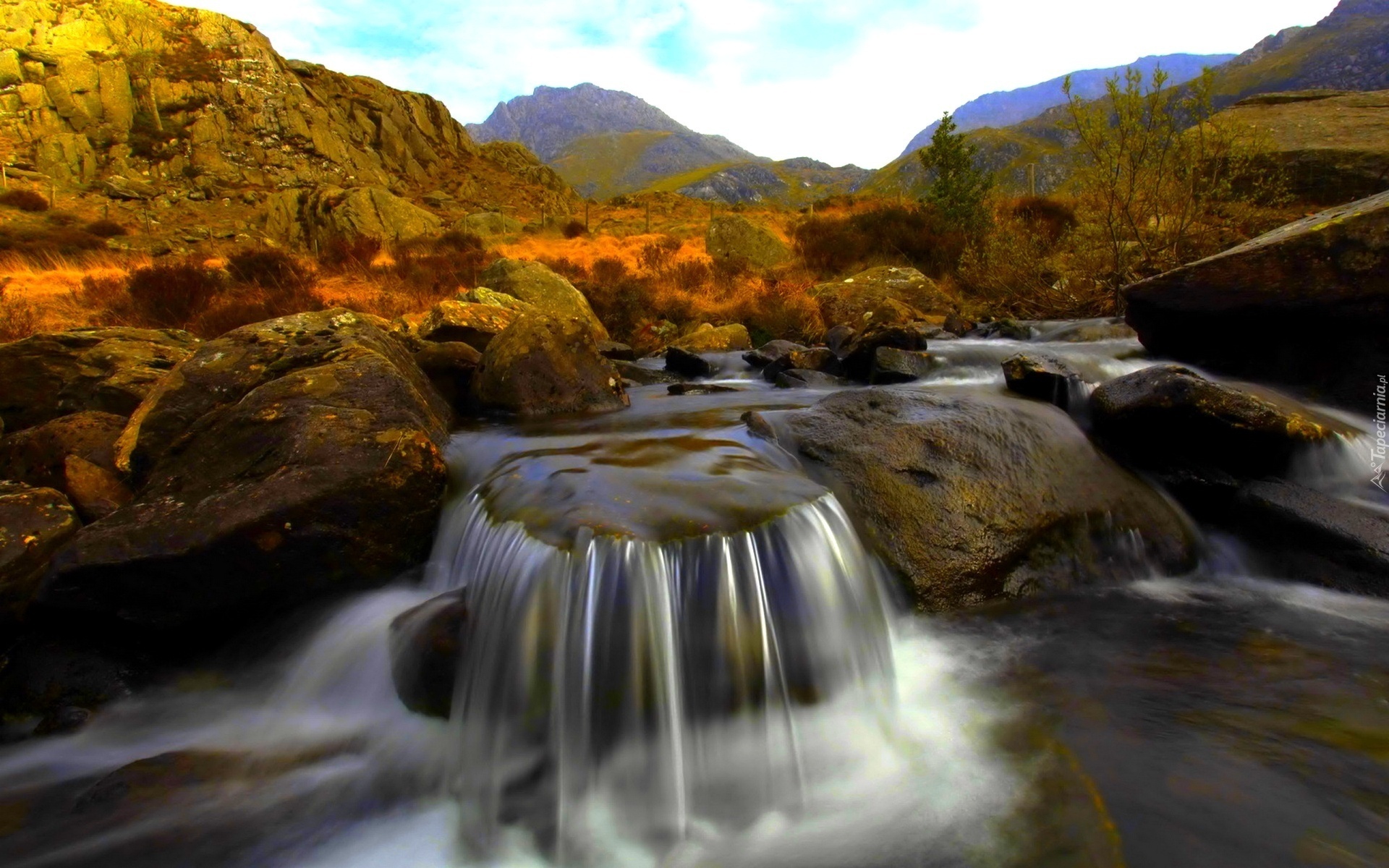 Edytor tapety: Rzeczka, Wodospad, Krzewy, Góry, Kamienie