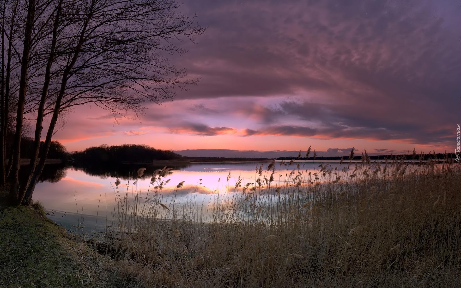 Edytor tapety: Jezioro, Trawy, Drzewa, Chmury