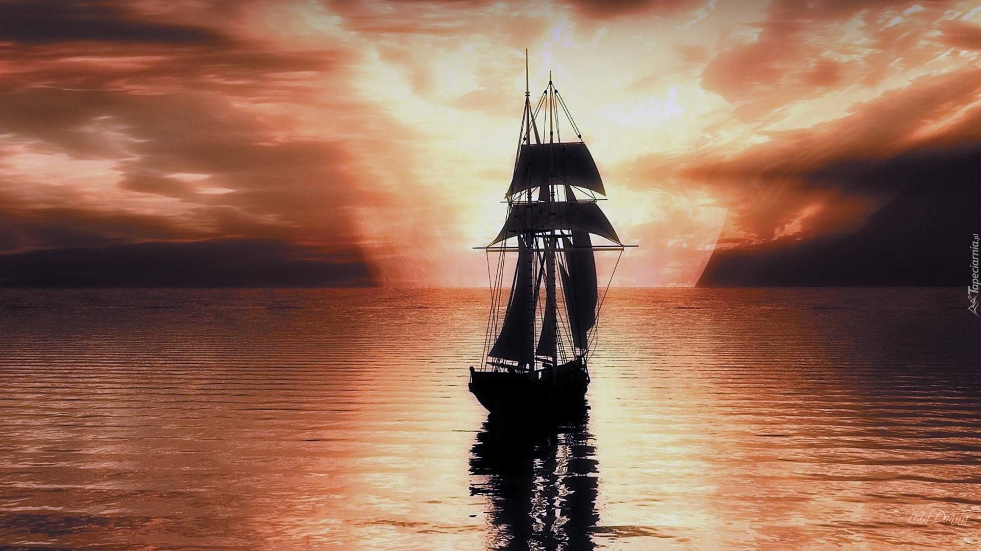 Edytor tapety: Zachód, Słońca, Morze, Żaglowiec