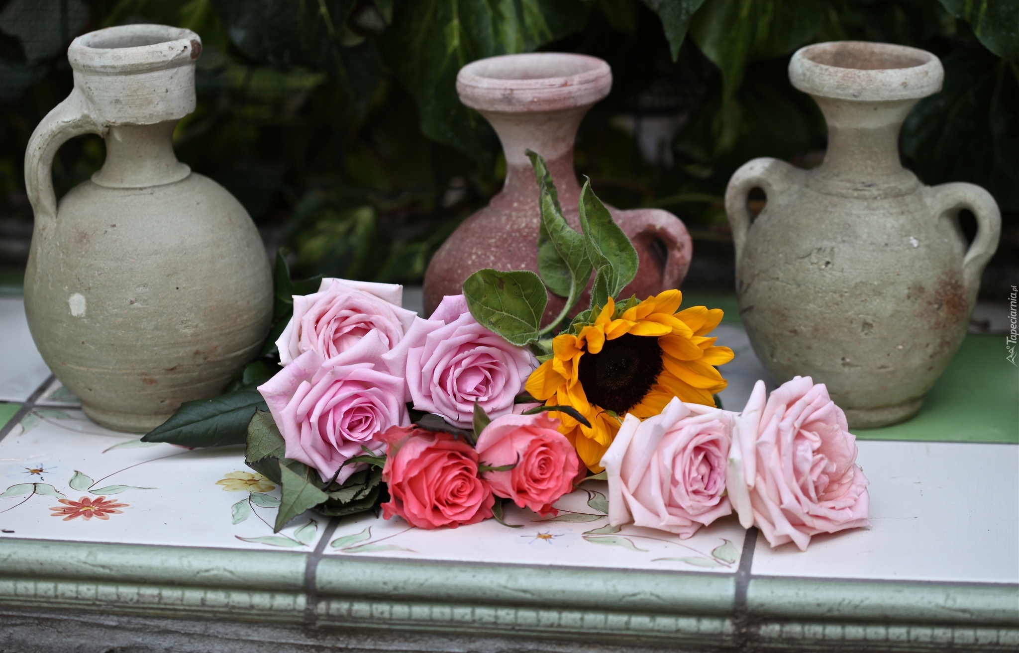 Edytor tapety: Róże, Słonecznik, Dzbany