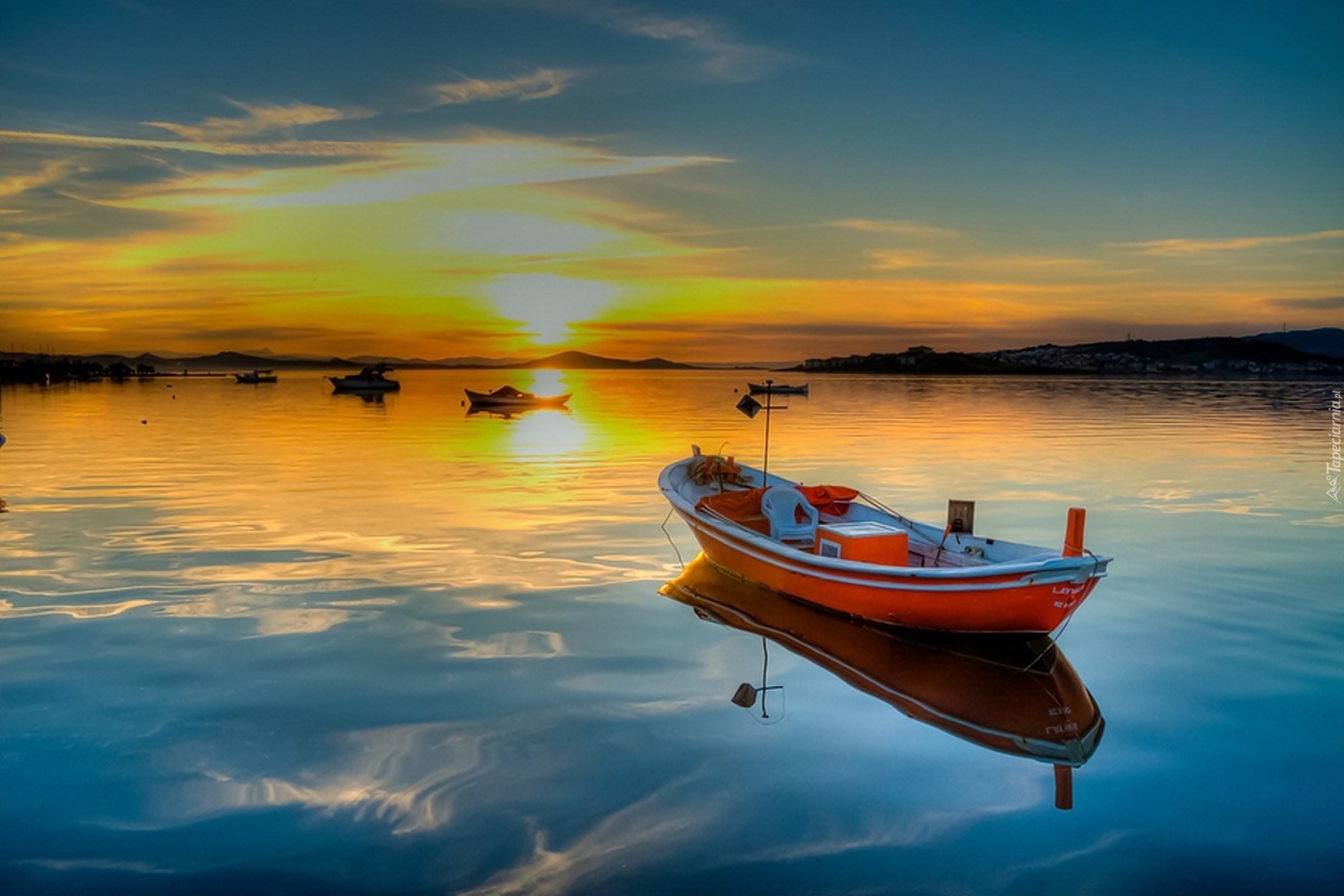 Edytor tapety: Jezioro, Łódka, Zachód, Słońca
