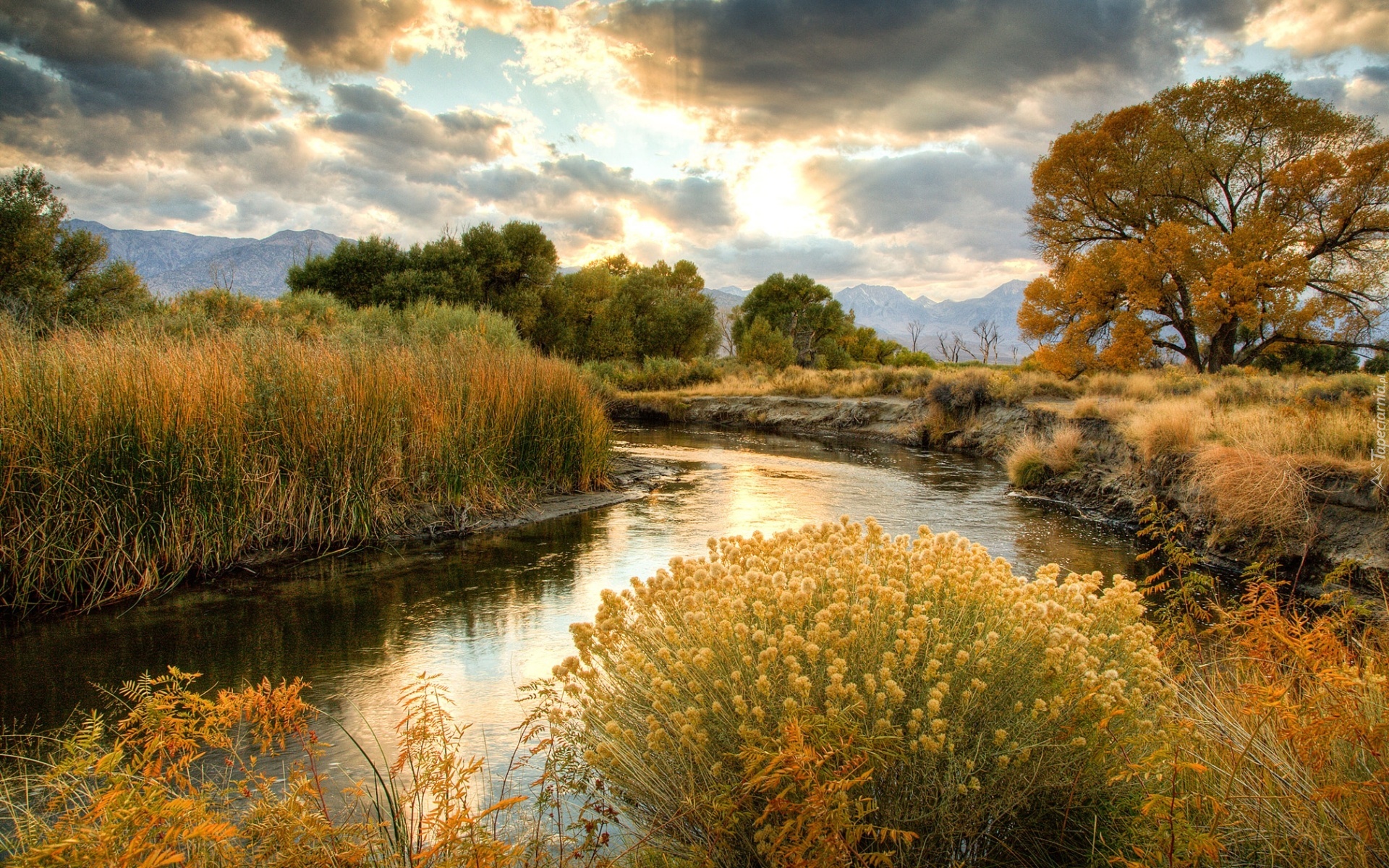 Edytor tapety: Rzeka, Zarośla, Drzewa, Chmury