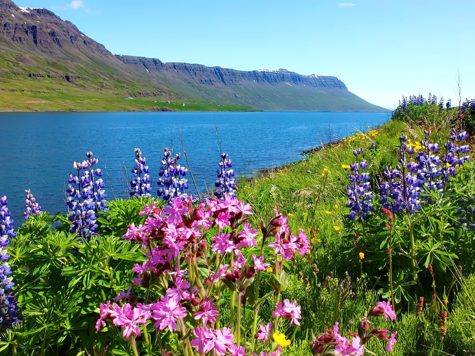 Edytor tapety: Łąka, Kwiaty, Rzeka, Góry