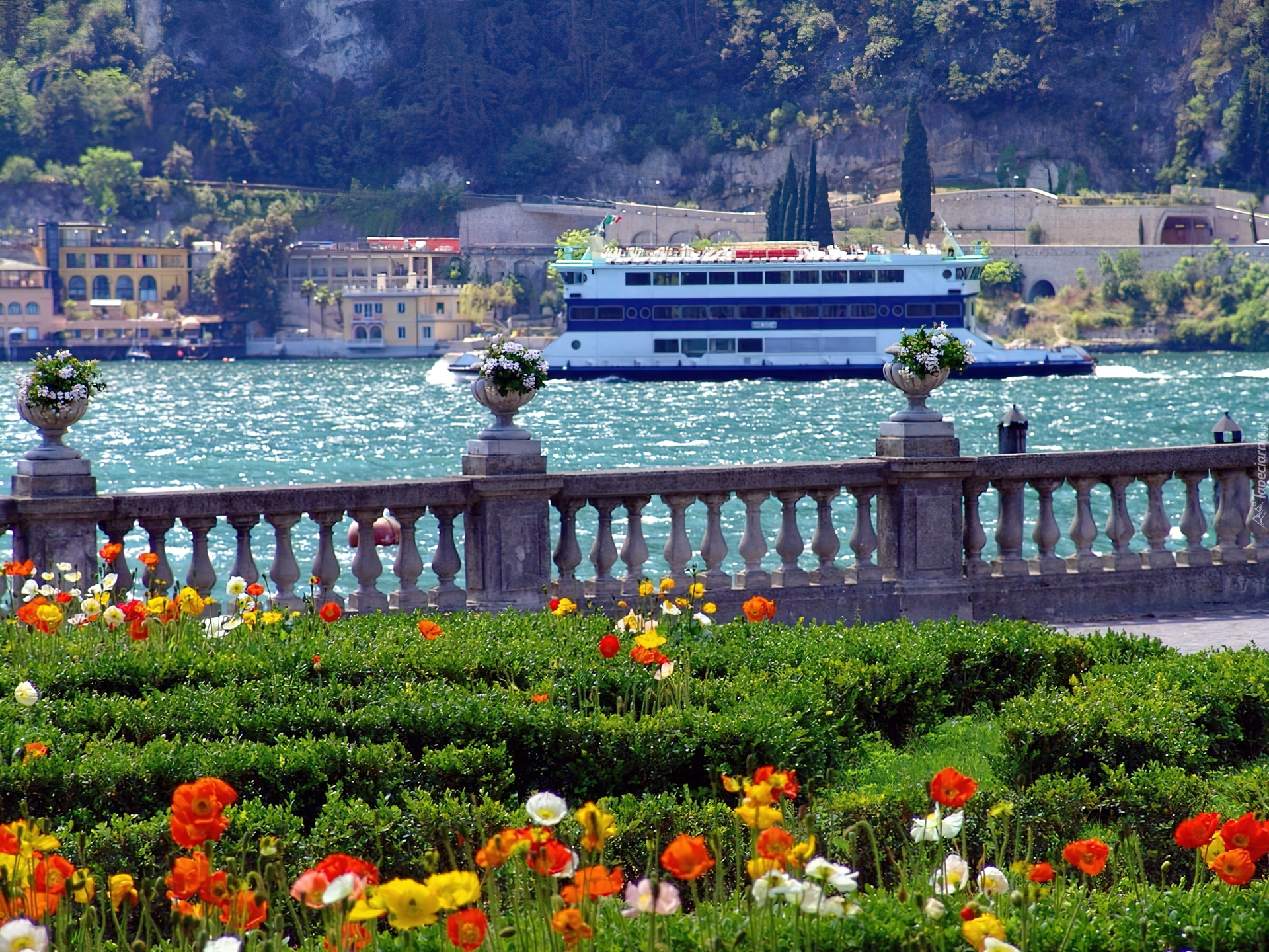 Edytor tapety: Klomb, Kwiaty, Balustrada, Rzeka