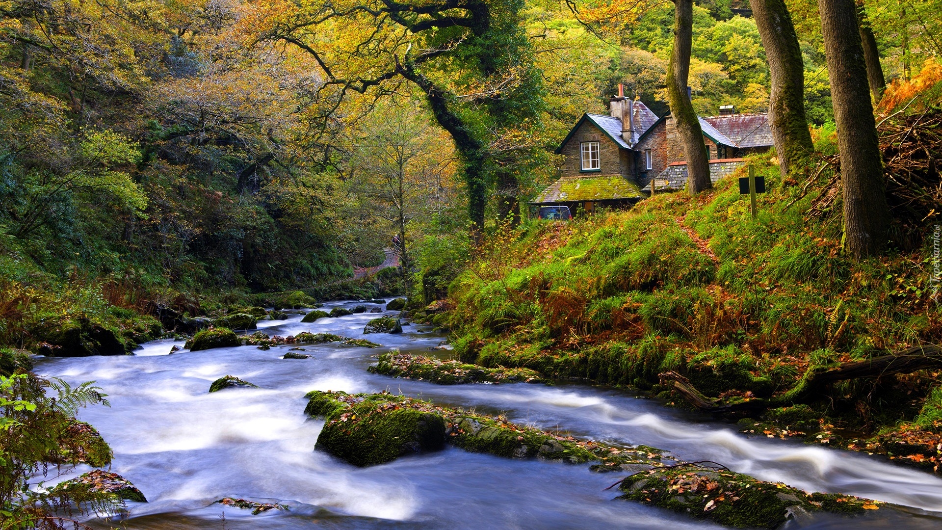 Edytor tapety: Rzeczka, Las, Domek, Jesień