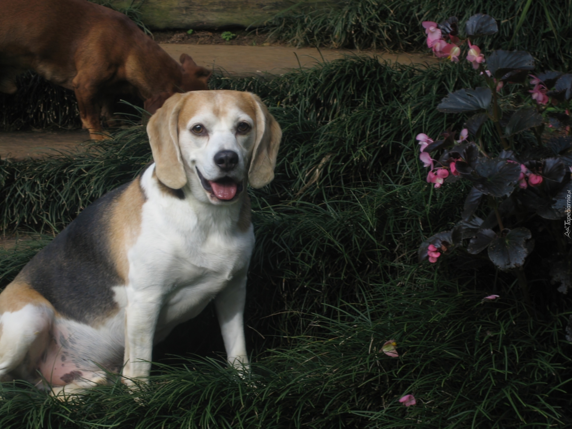 Edytor tapety: Piesek, Beagle, Trawa, Kwiatki