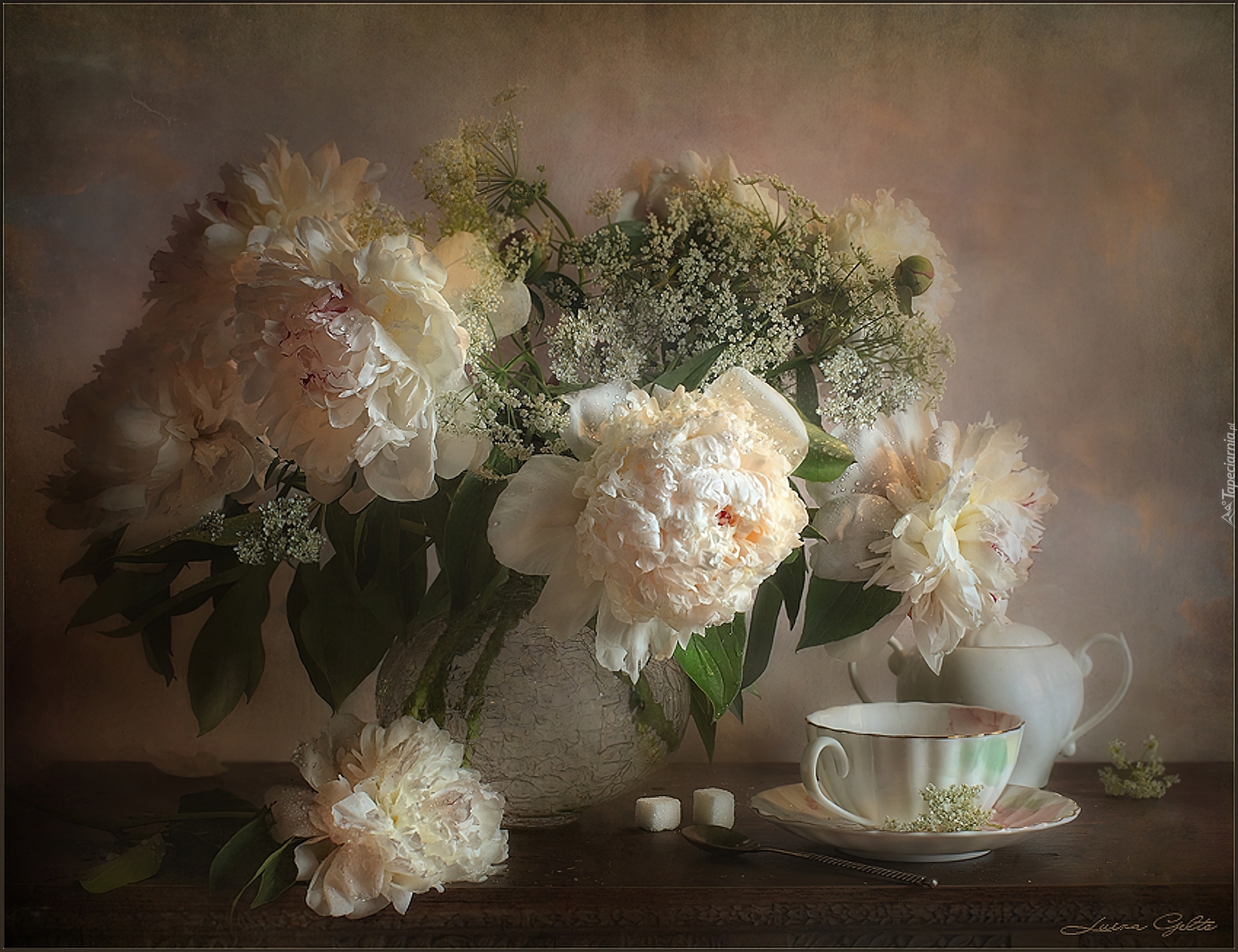 Edytor tapety: Piwonie, Filiżanka, Imbryk