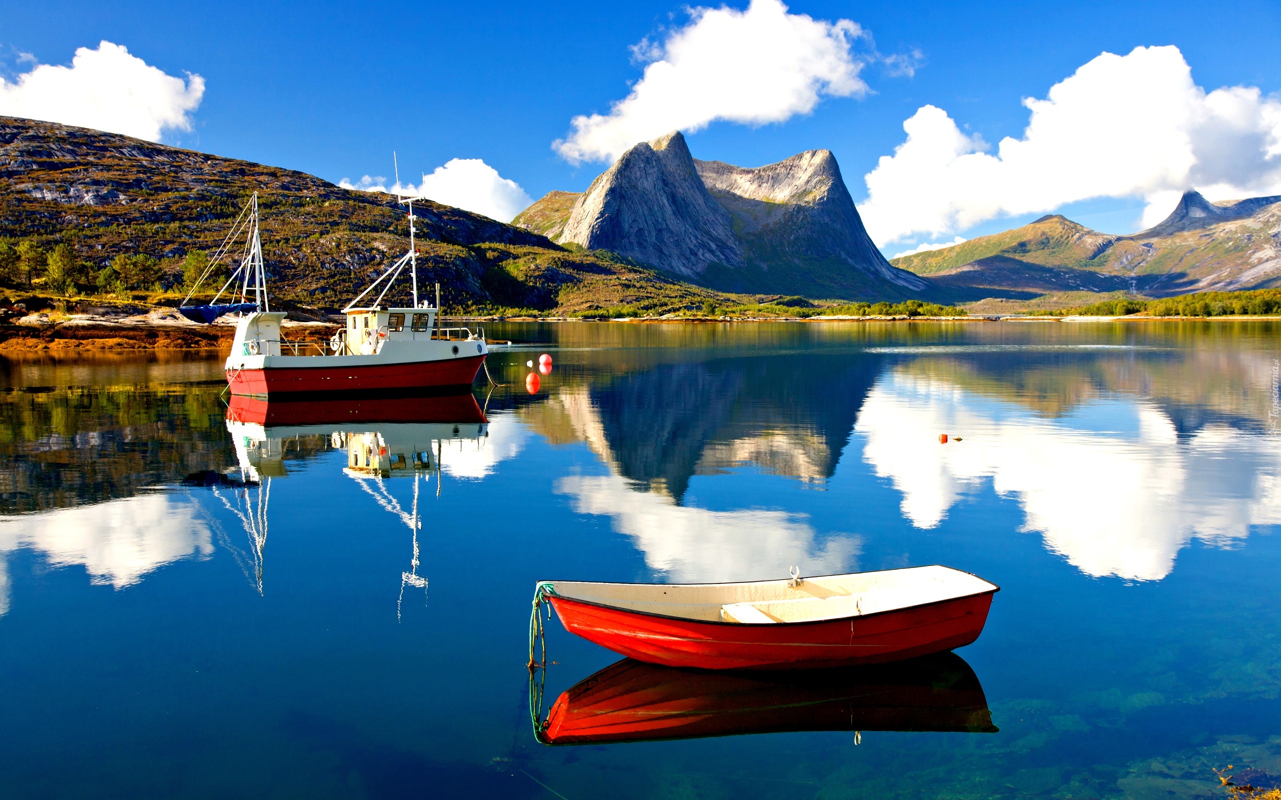 Edytor tapety: Góry, Chmury, Jezioro, Łodzie, Odbicie