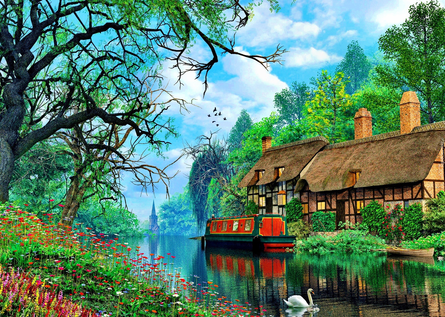 Edytor tapety: Kwiaty, Rzeka, Dom, Barka, Obraz