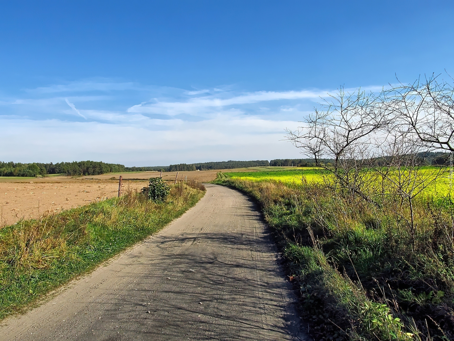 Edytor tapety: Droga, Pola, Gryka, Krzew, Las, Chmury
