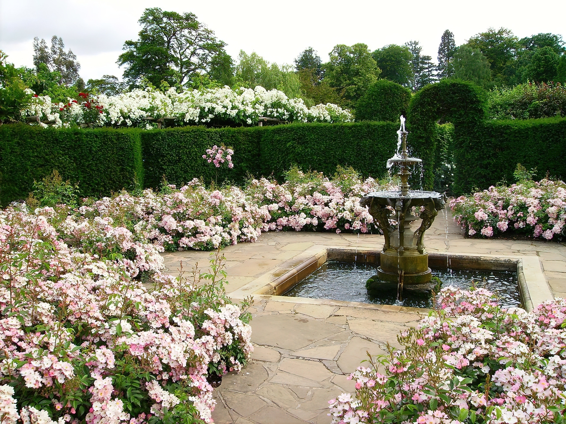 Edytor tapety: Ogród, Różany, Fontanna, Żywopłot