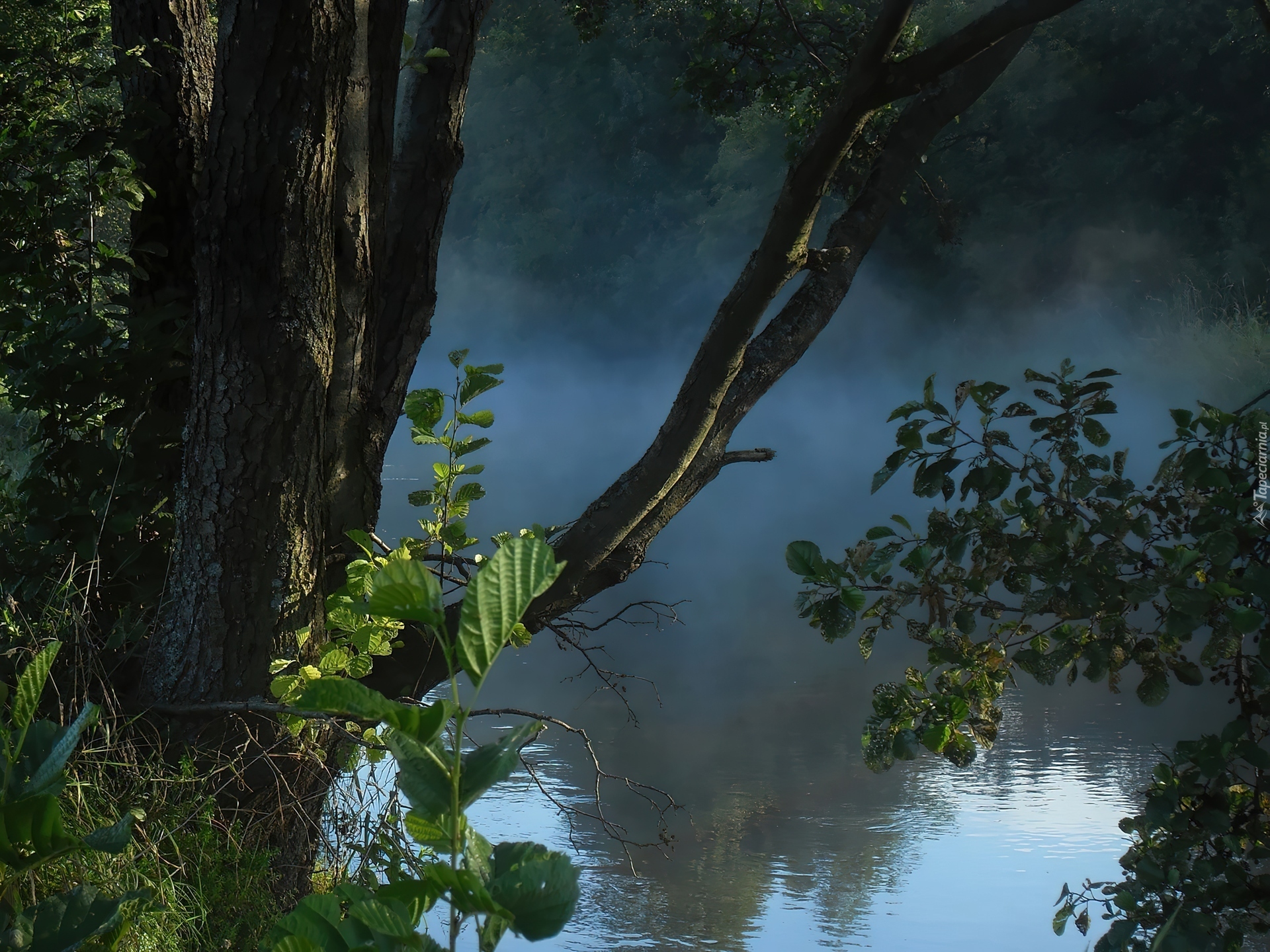 Edytor tapety: Drzewo, Liście, Rzeka, Mgła