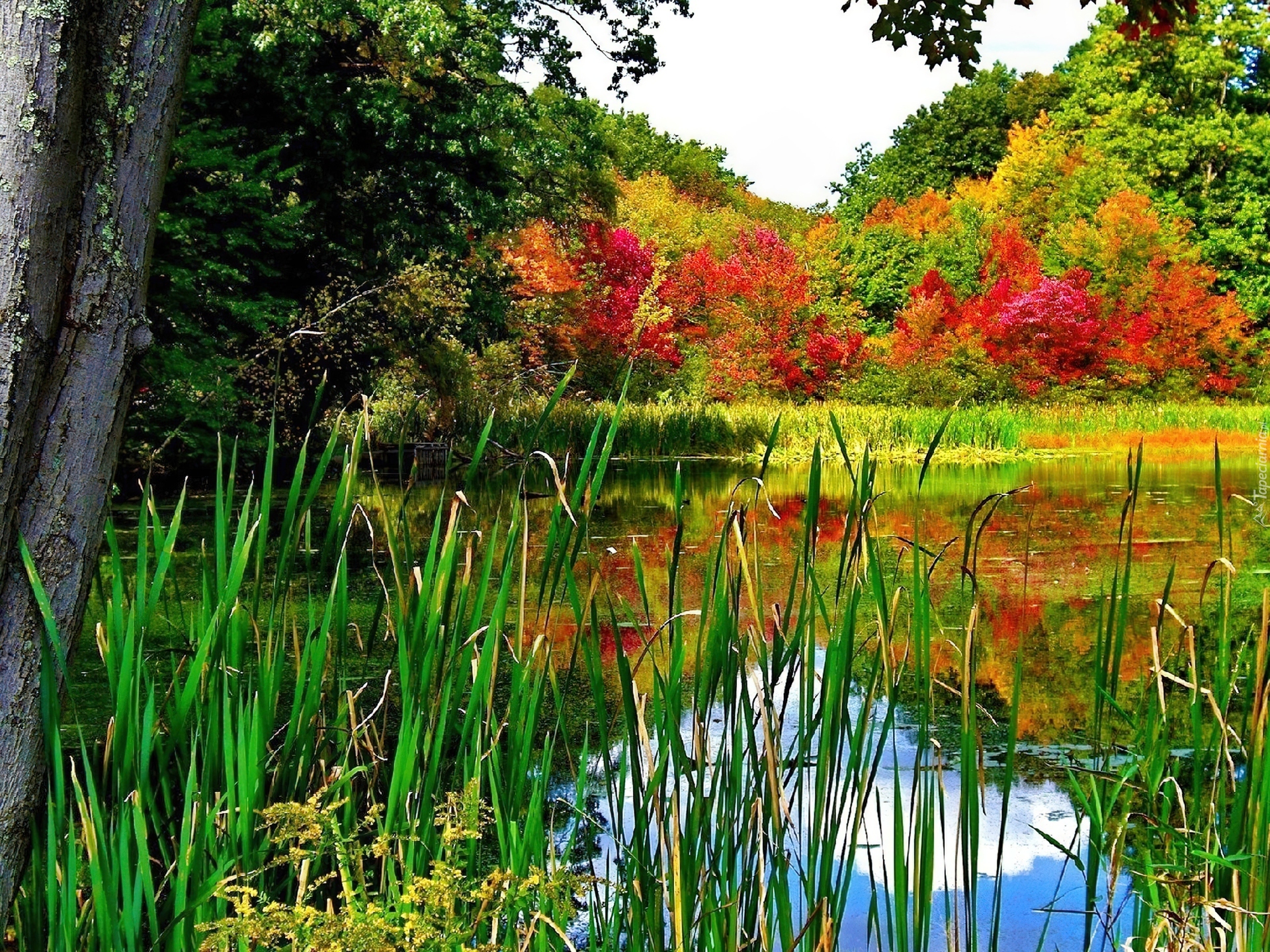 Edytor tapety: Jezioro, Szuwary, Jesienne, Drzewa