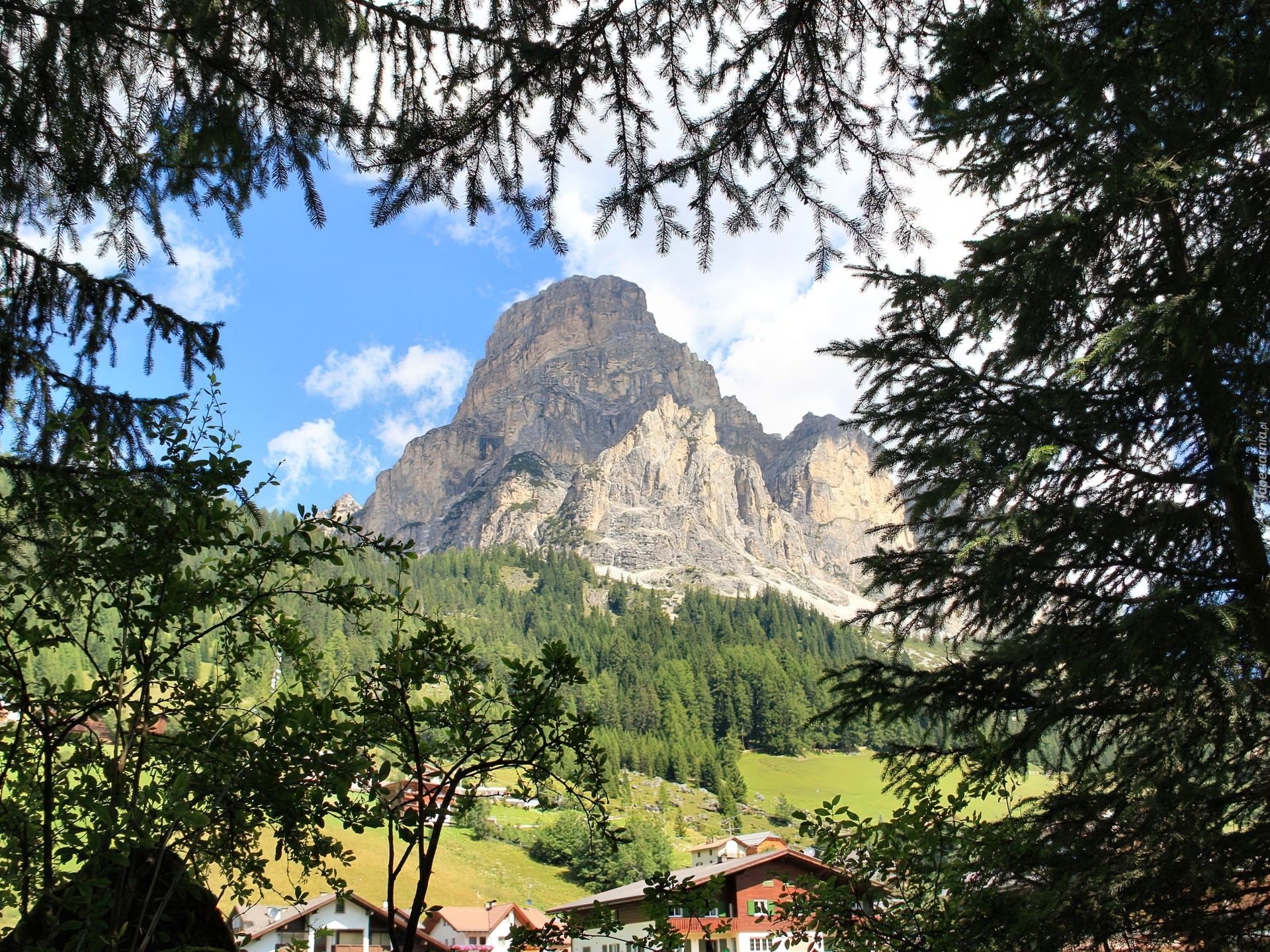 Edytor tapety: Góra, Las, Świerki, Domy