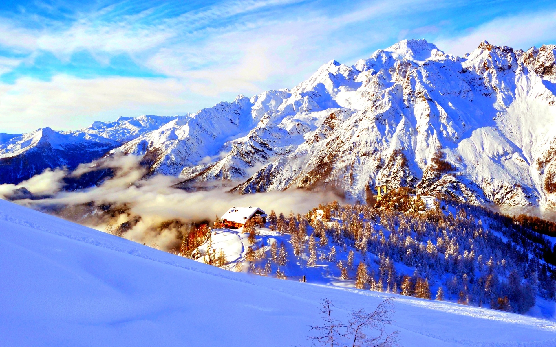 Edytor tapety: Zima, Góry, Dom, Zbocze