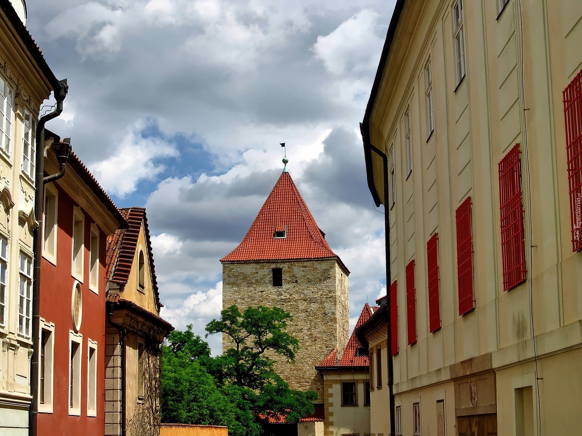 Edytor tapety: Praga, Zabytki, Domy, Ulica, Akacja, Chmury