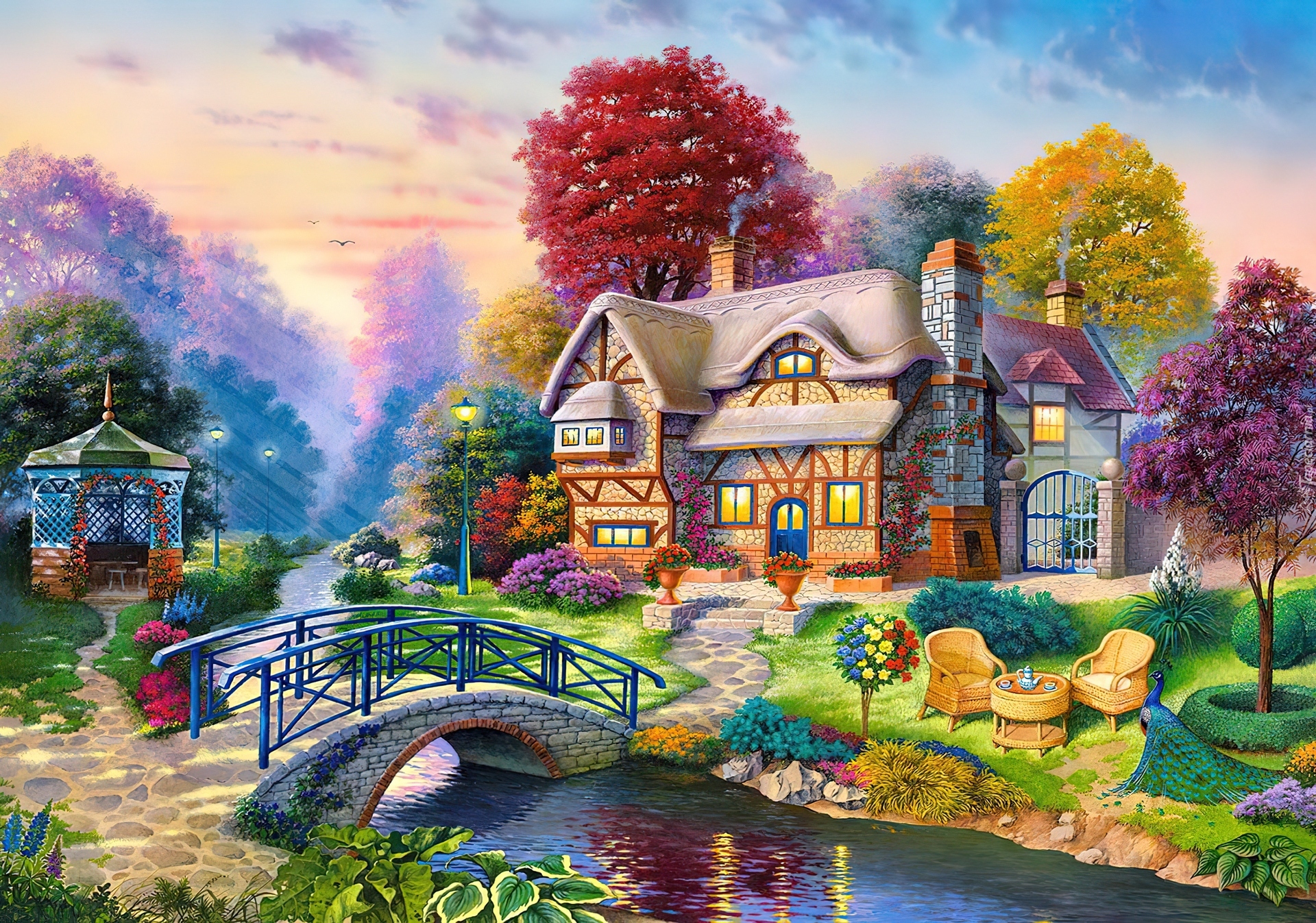 Edytor tapety: Dom, Rzeczka, Mostek, Widoczek, Malarstwo