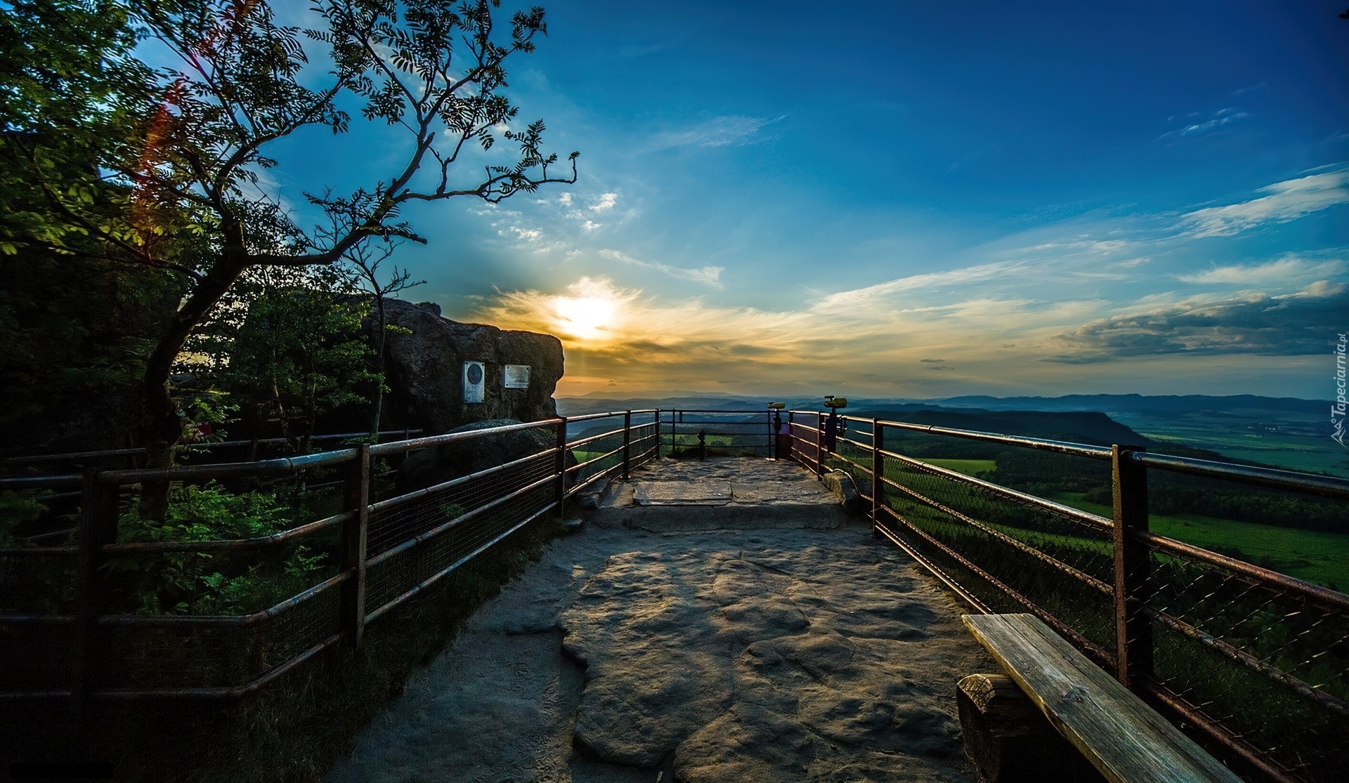 Edytor tapety: Zachód, Słońca, Mostek, Skała, Drzewo