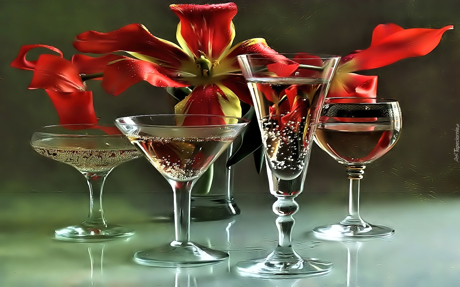 Edytor tapety: Kieliszki, Szampan, Czerwony, Kwiat
