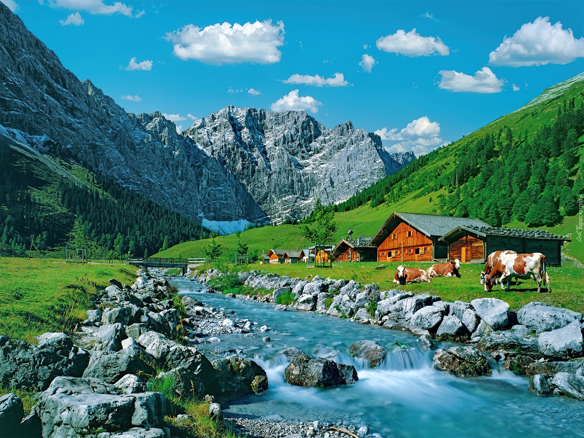 Edytor tapety: Góry, Rzeka, Dom, Kamienie, Krowy