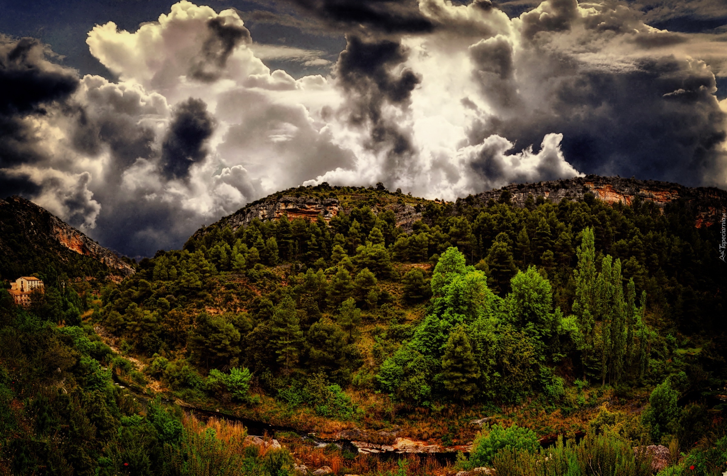 Edytor tapety: Góry, Drzewa, Niebo, Chmury, Widok