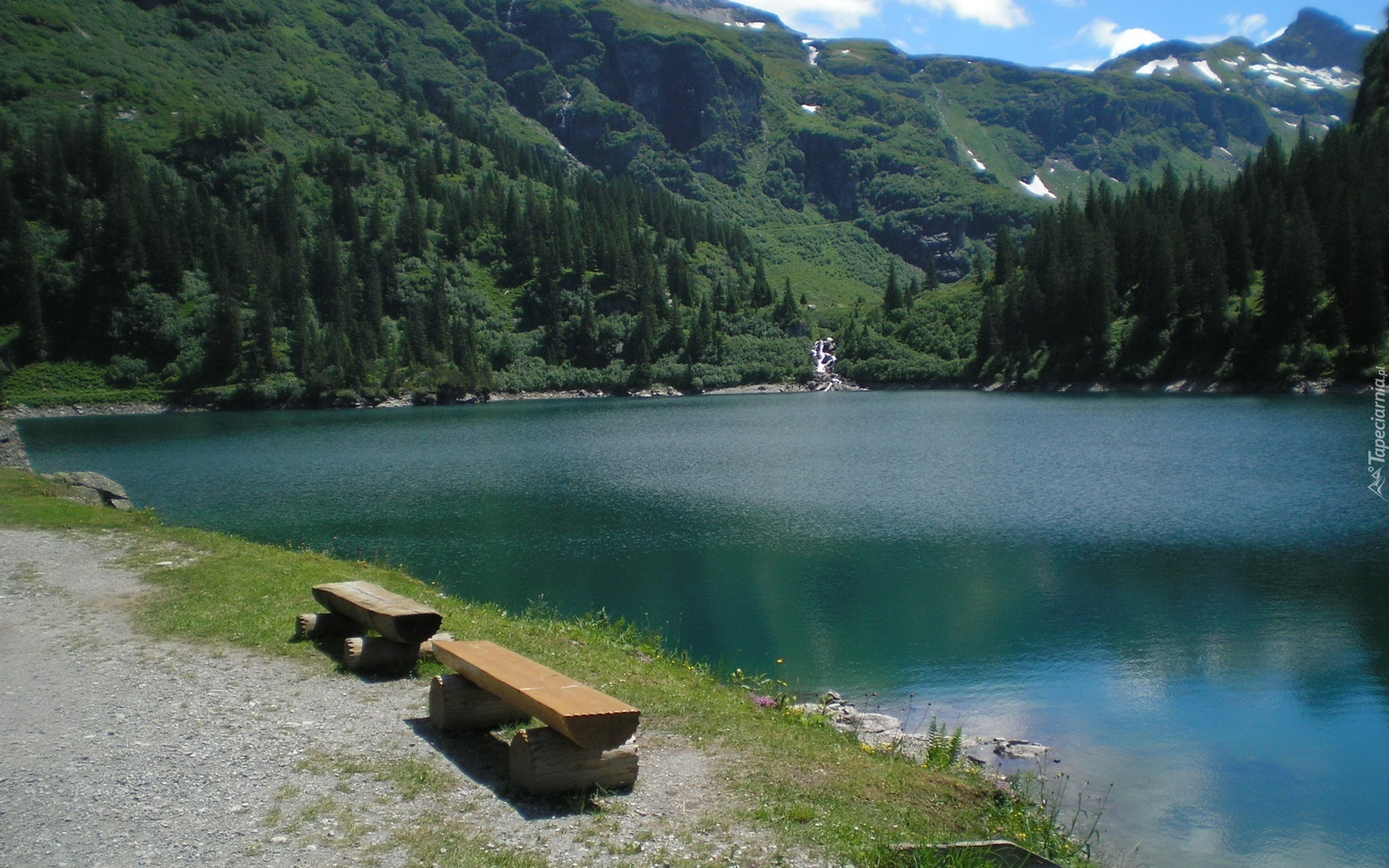 Edytor tapety: Jezioro, Góry, Lasy, Ławki