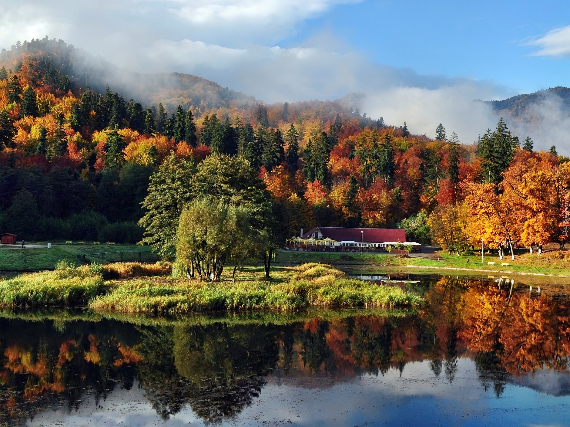 Edytor tapety: Góry, Las, Chmury, Staw