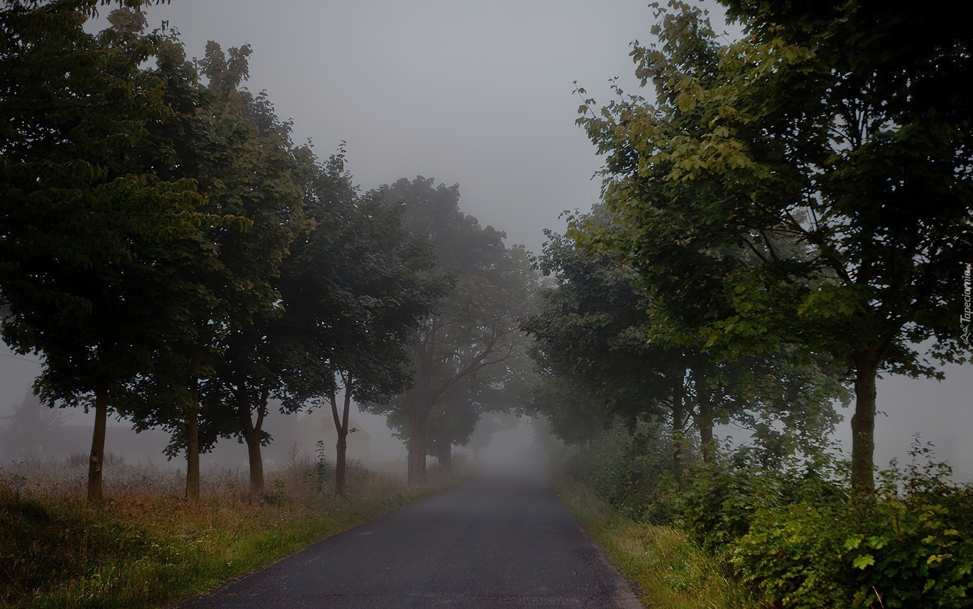 Edytor tapety: Droga, Mgła, Drzewa, Zarośla