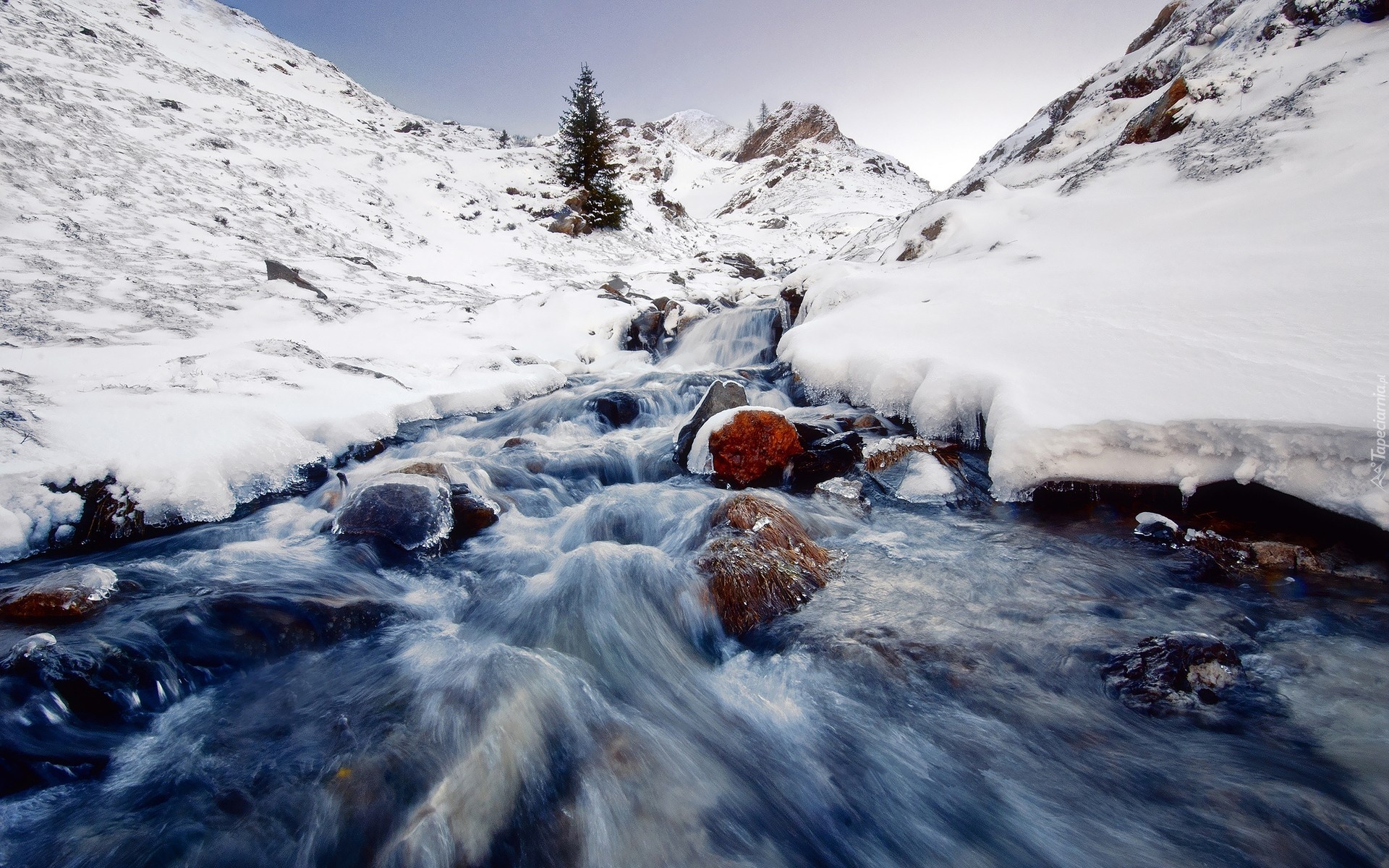Edytor tapety: Zima, Ośnieżone, Góry, Kamienie, Rwący, Potok