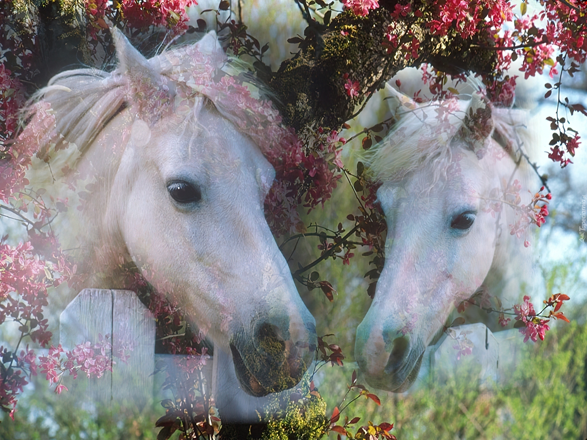 Edytor tapety: Dwa, Konie, Kwitnące, Drzewa