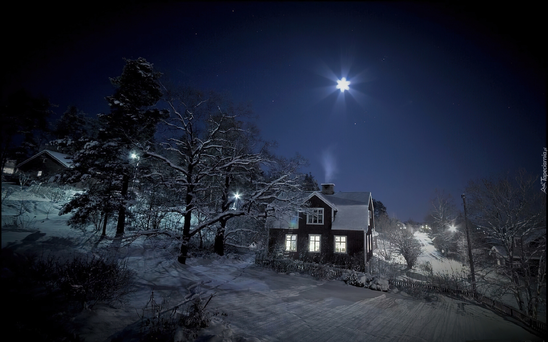 Edytor tapety: Domek, Drzewa, Śnieg, Gwiazda