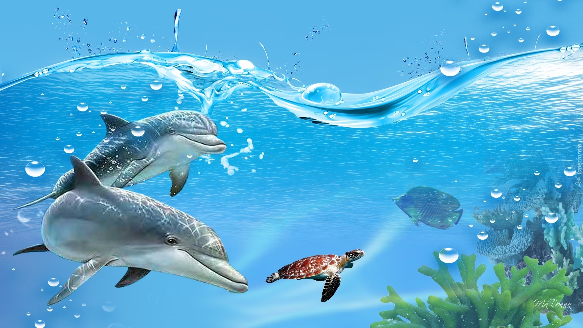 Edytor tapety: Dwa, Delfiny, Żółw, Woda
