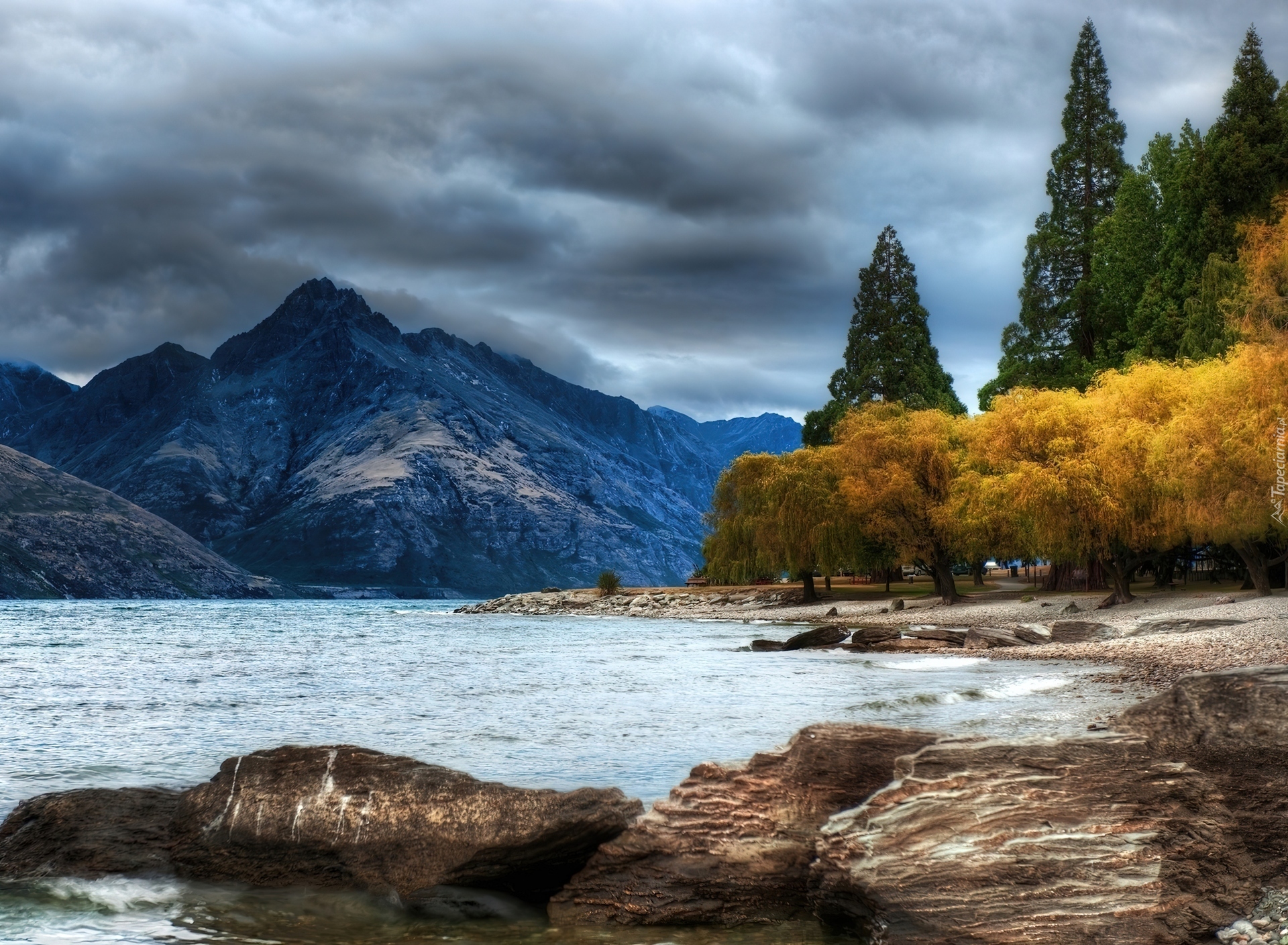 Edytor tapety: Jezioro, Kamienie, Las, Góry, Chmury