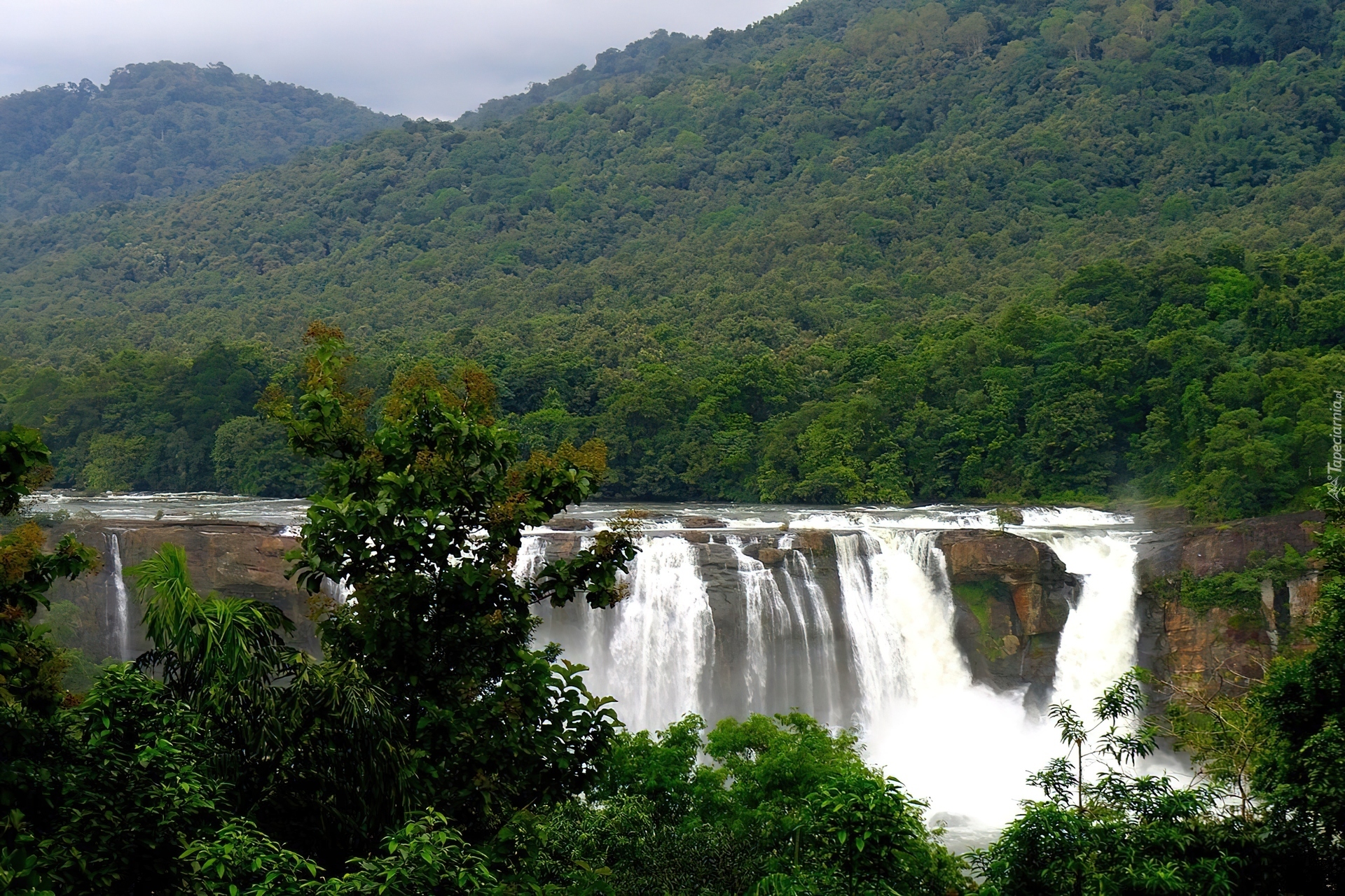 Edytor tapety: Wodospad, Zalesione, Góry