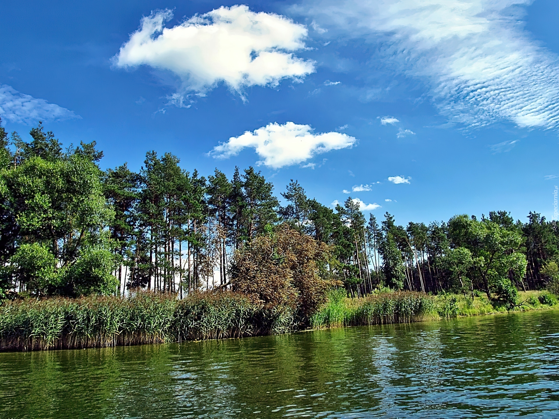 Edytor tapety: Jezioro, Drzewa, Trawy, Pokrzywy, Niebo, Chmury