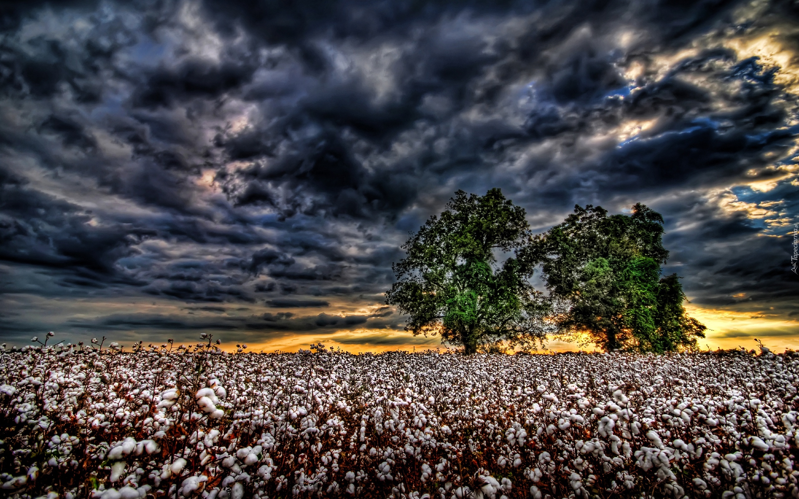 Edytor tapety: Zachód, Słońca, Chmury, Drzewa, Bawełna