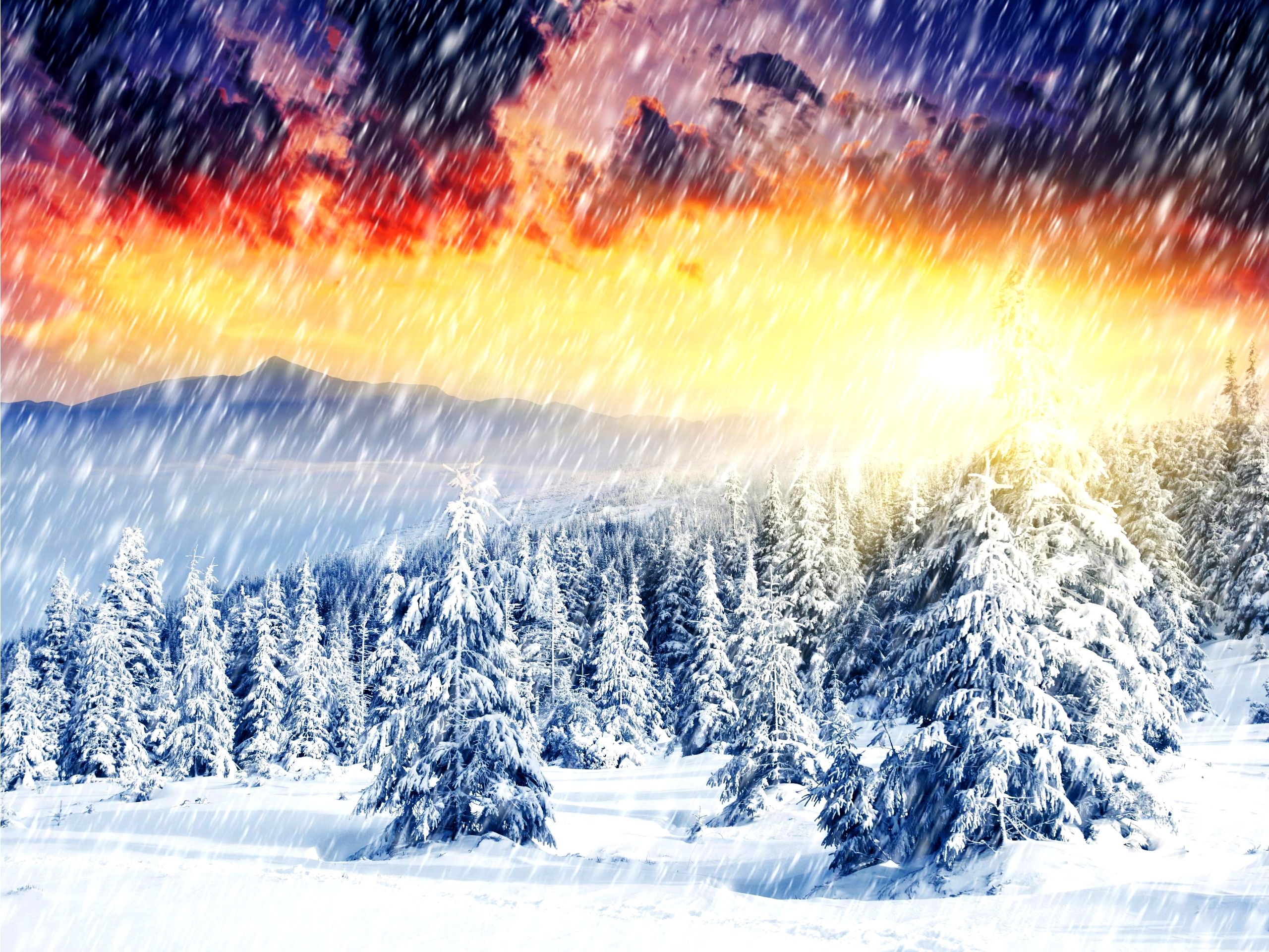 Edytor tapety: Zachód, Słońca, Góry, Lasy, Śnieg