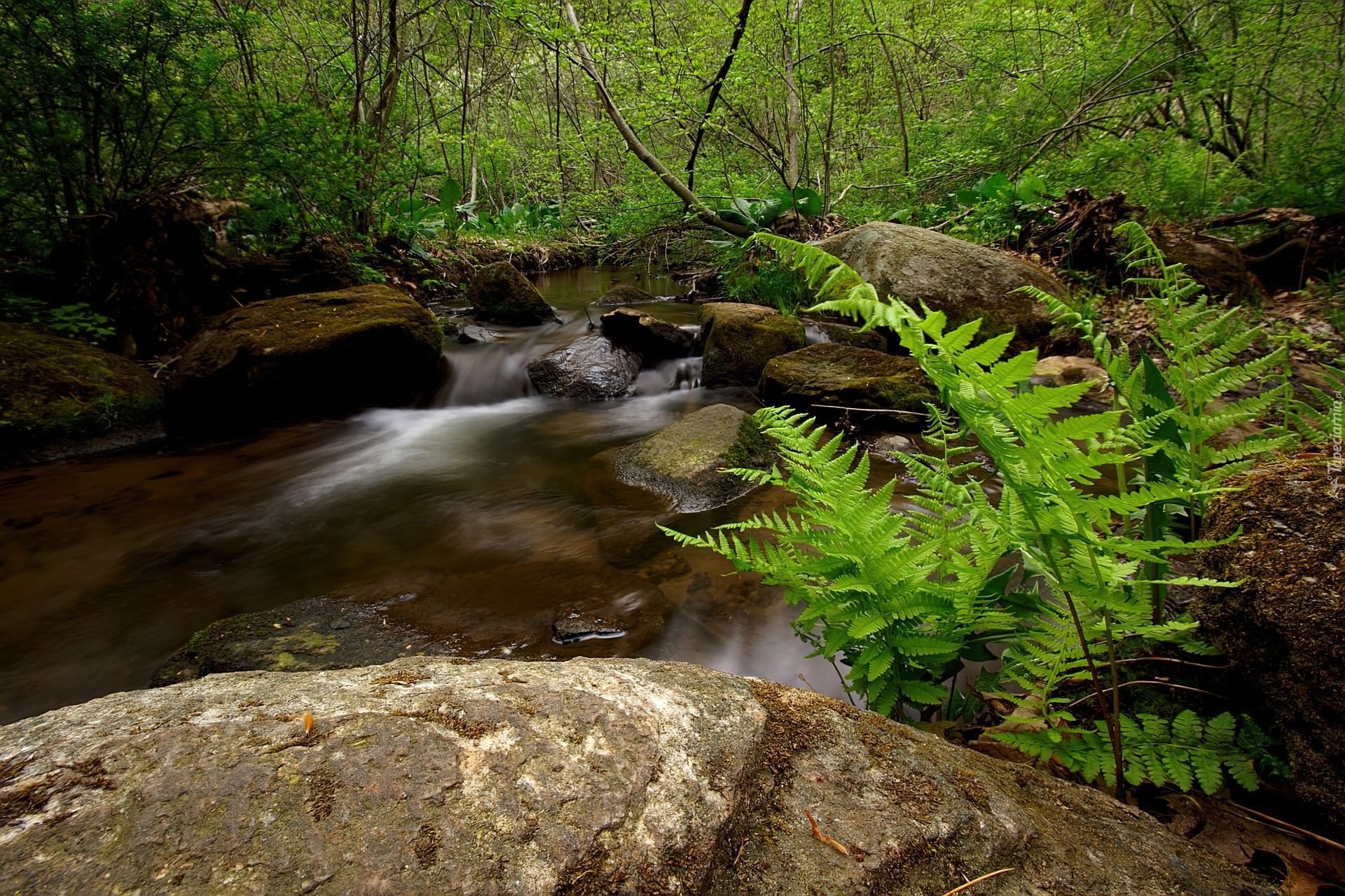 Edytor tapety: Rzeka, Kamienie, Paproć, Las