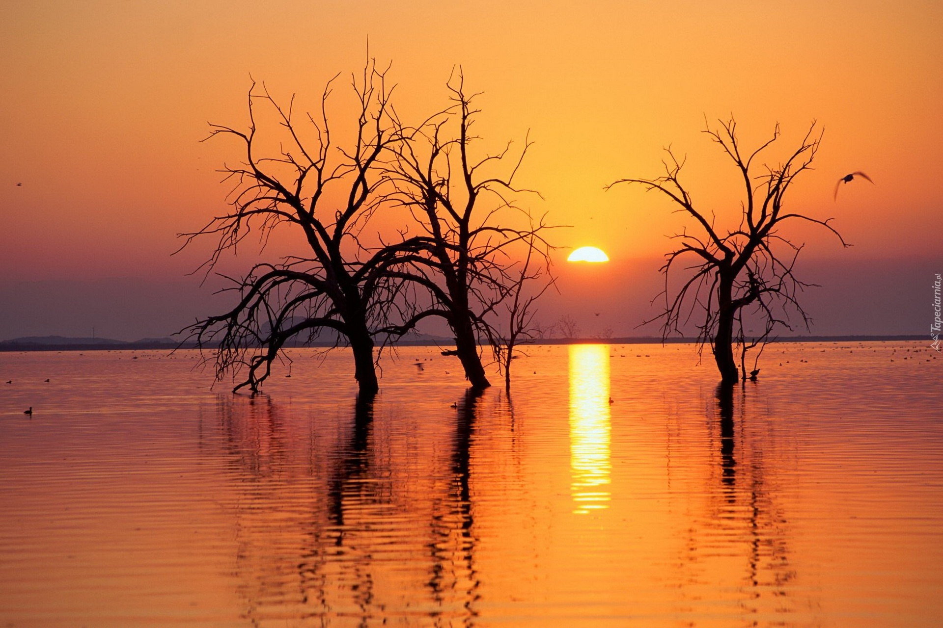 Edytor tapety: Zachód, Słońca, Jezioro, Trzy, Samotne, Suche, Drzewa
