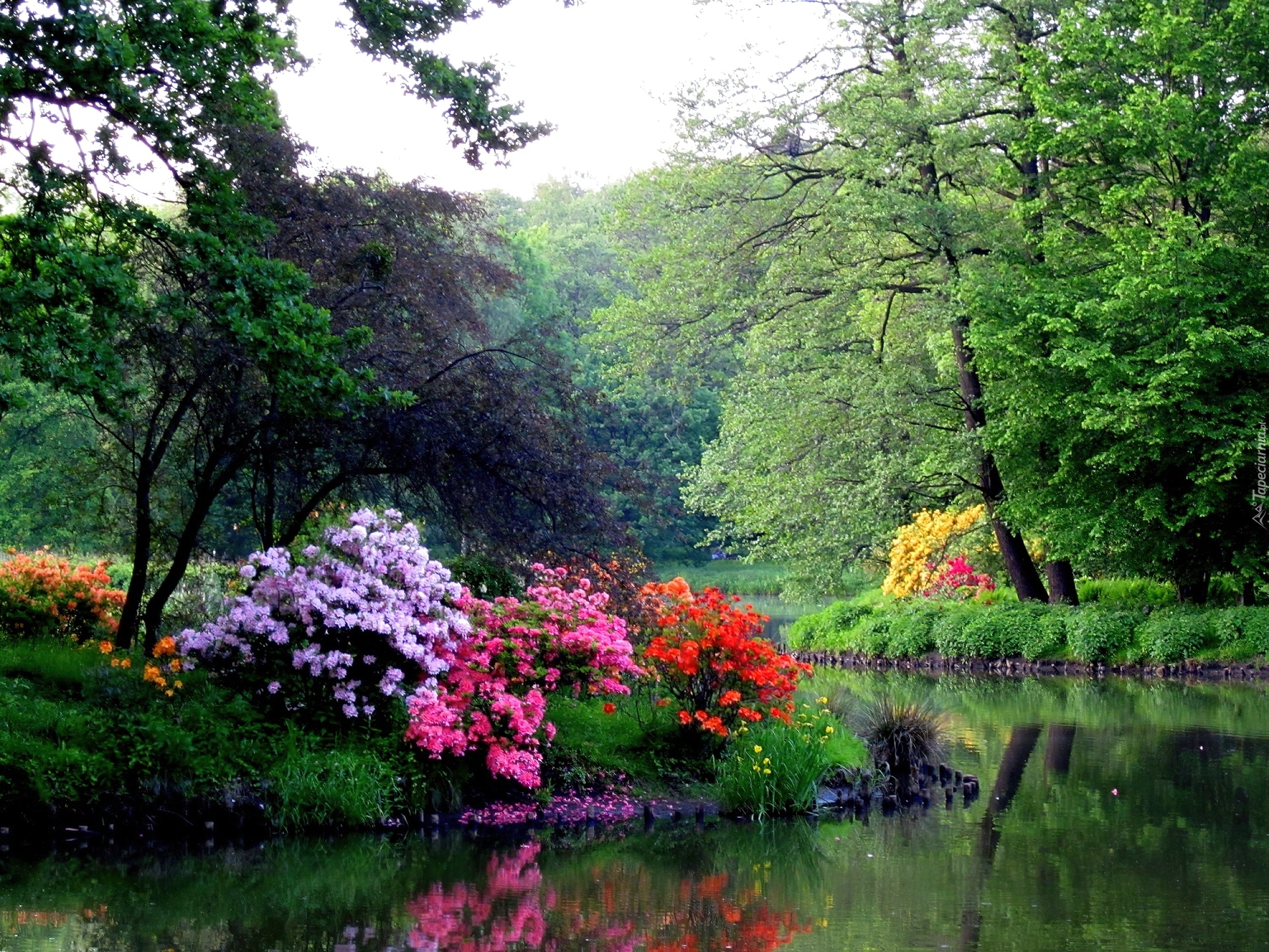 Edytor tapety: Wiosna, Park, Woda, Rododendrony