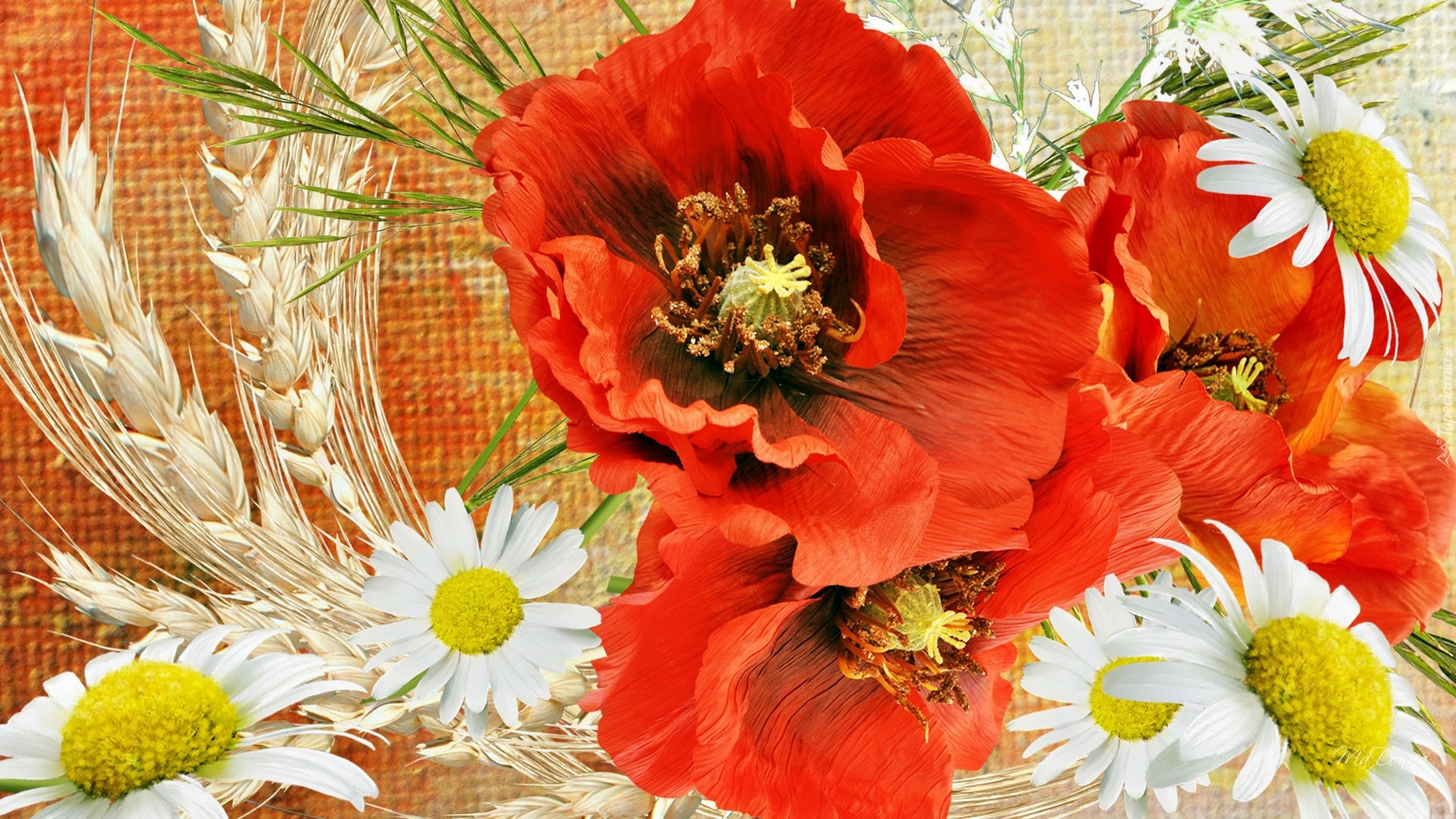 Edytor tapety: Czerwone, Maki, Stokrotki, Art