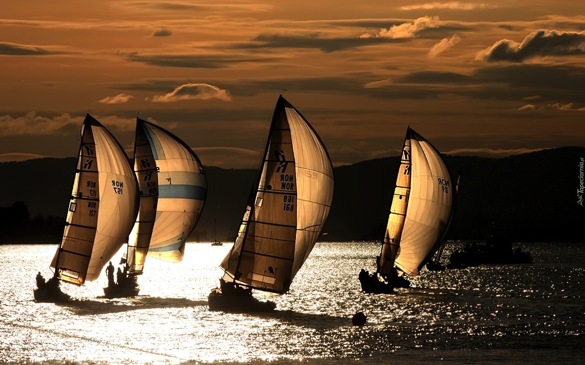 Edytor tapety: Zachód, Słońca, Jezioro, Żaglówki