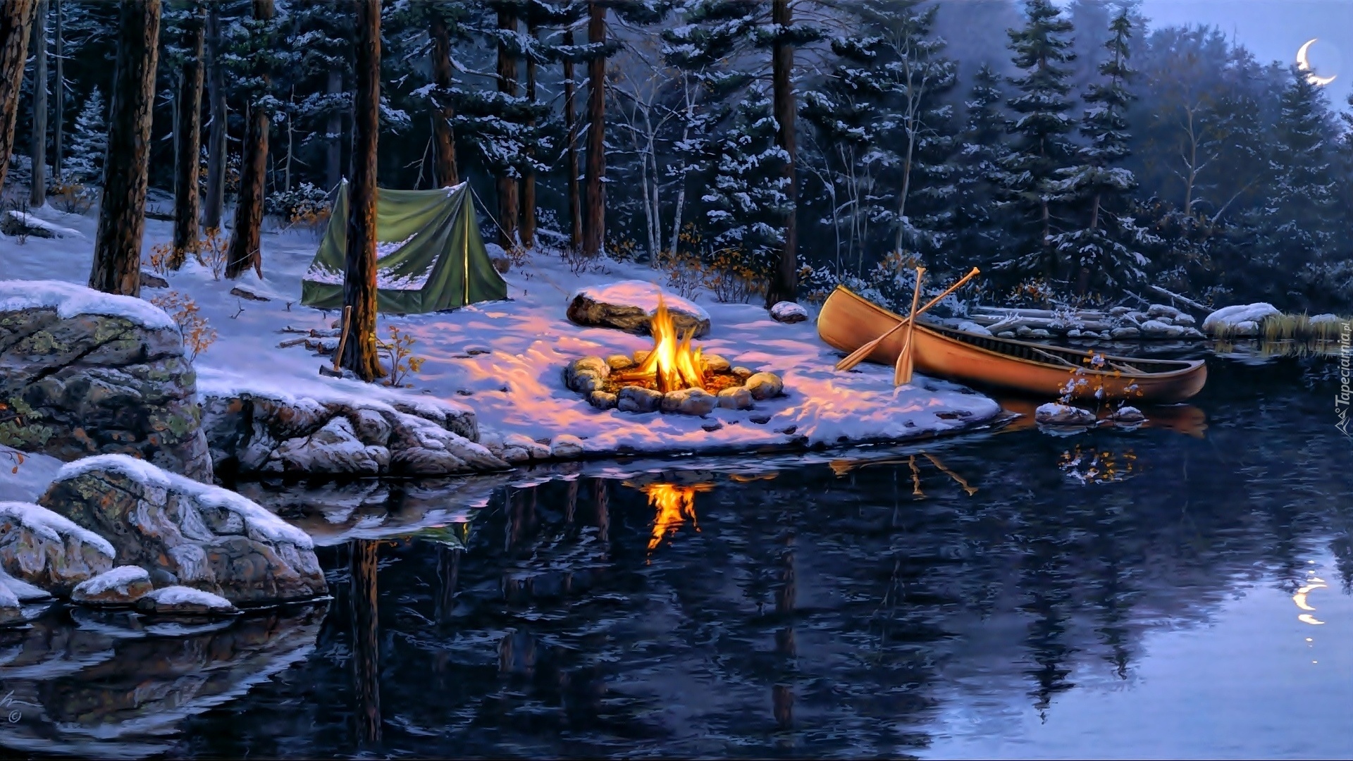 Edytor tapety: Las, Jezioro, Ognisko, Obraz, Darrell Bush