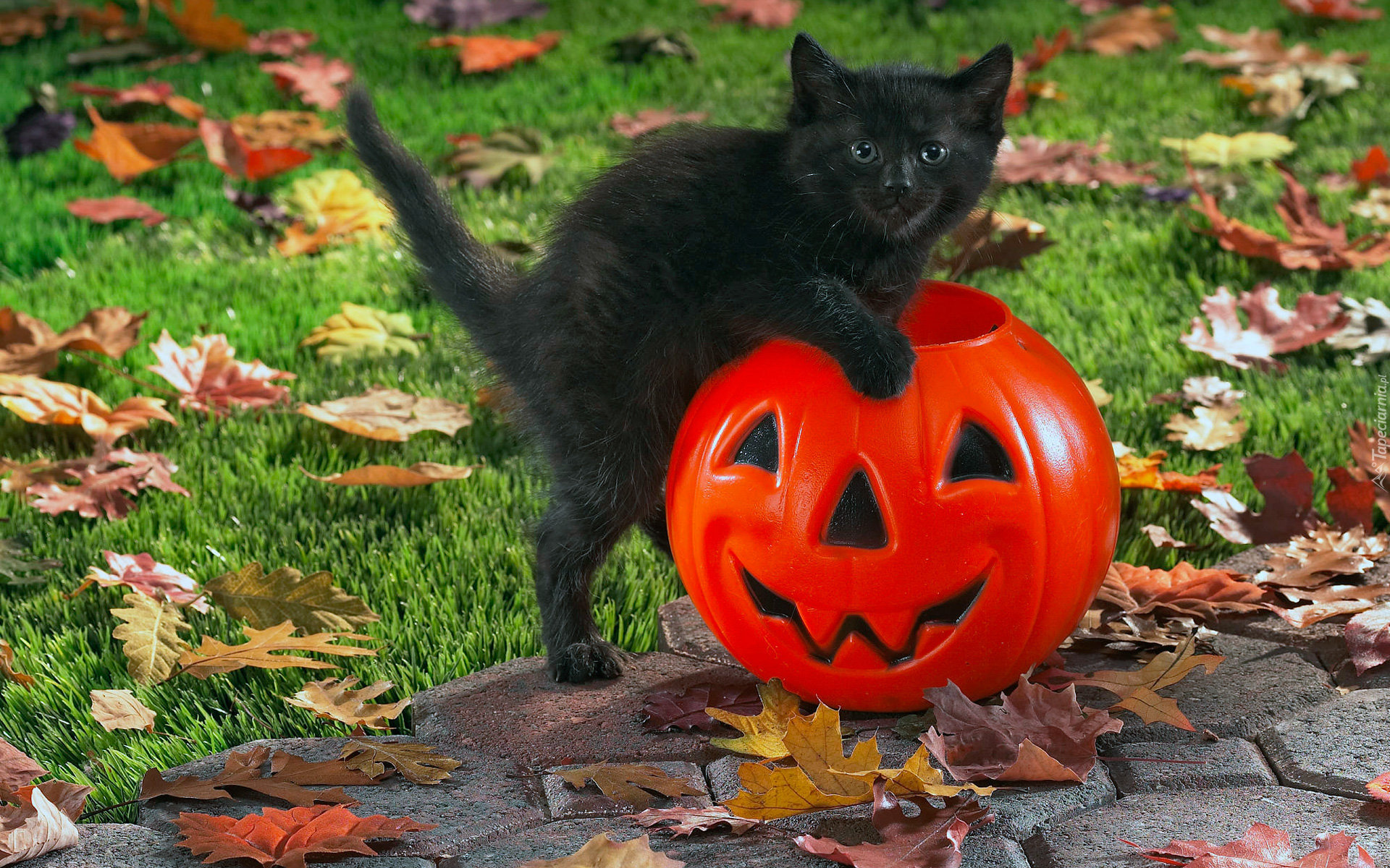 Edytor tapety: Halloween, Czarny, Kotek, Dynia