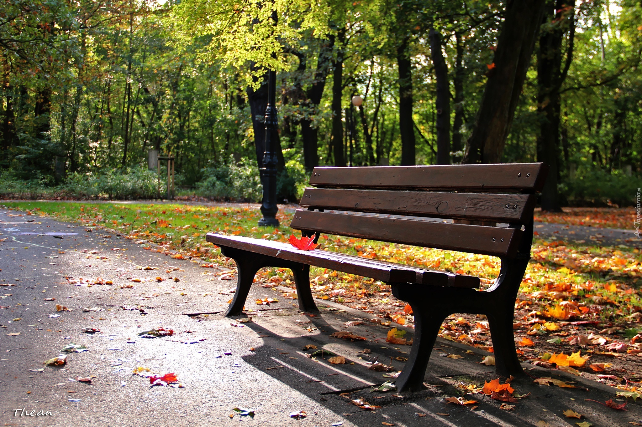 Edytor tapety: Park, Ławka, Czerwony, Liść