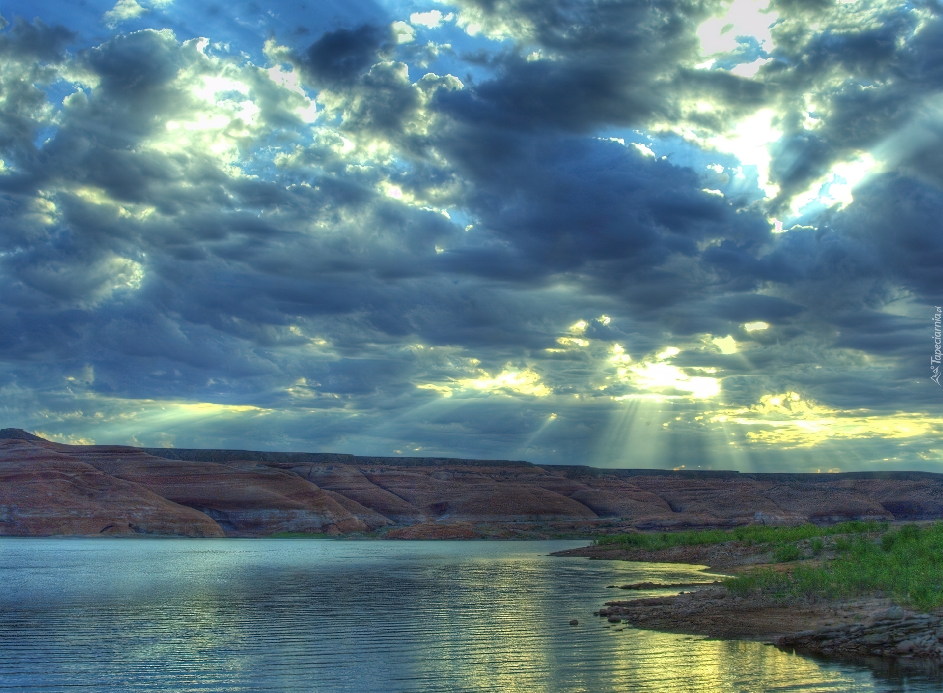 Edytor tapety: Jezioro, Góry, Chmury, Promienie Słońca