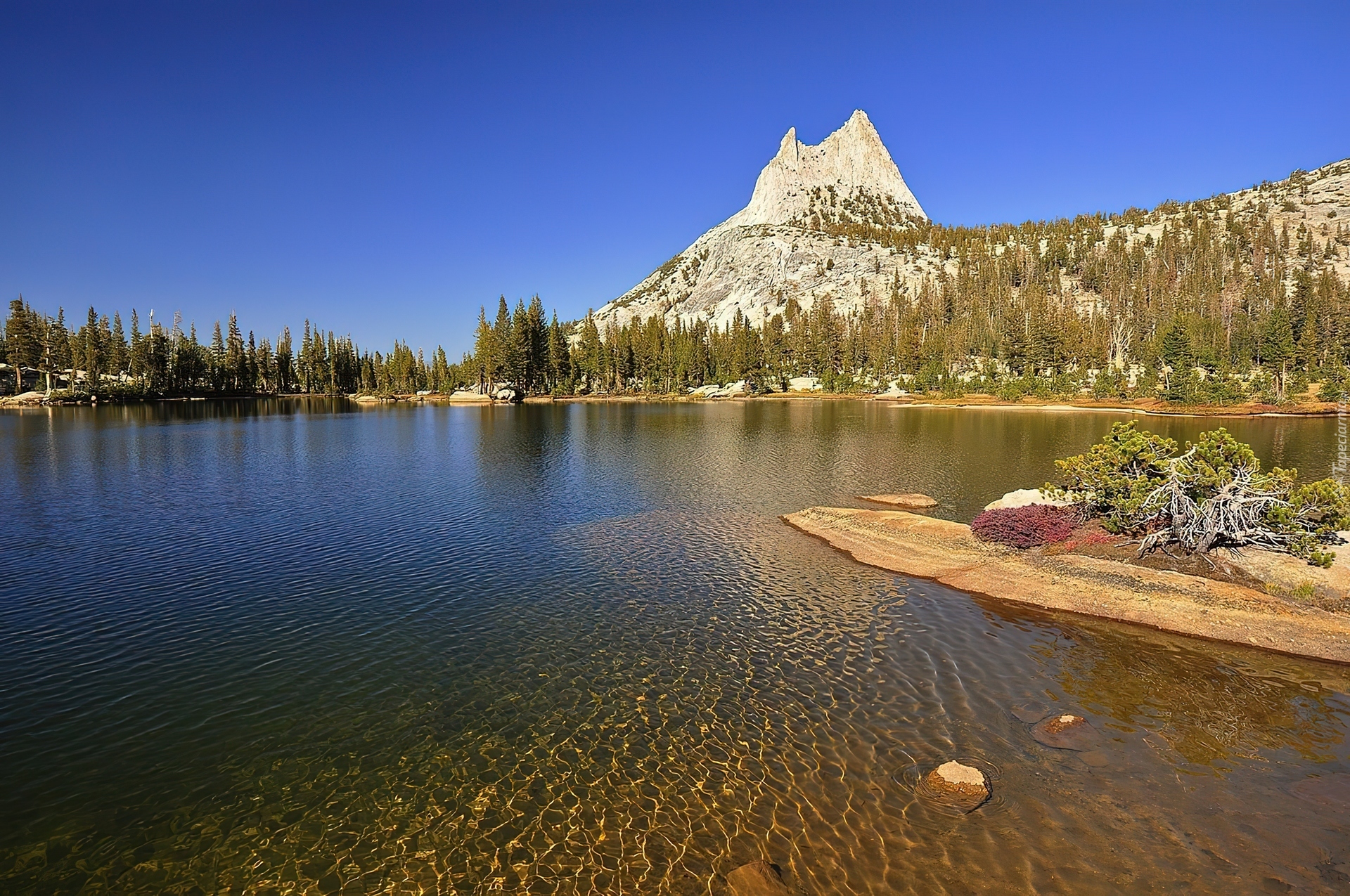 Edytor tapety: Stany Zjednoczone, Stan Kalifornia, Park Narodowy Yosemite, Jezioro, Góra Cathedral Peak, Drzewa
