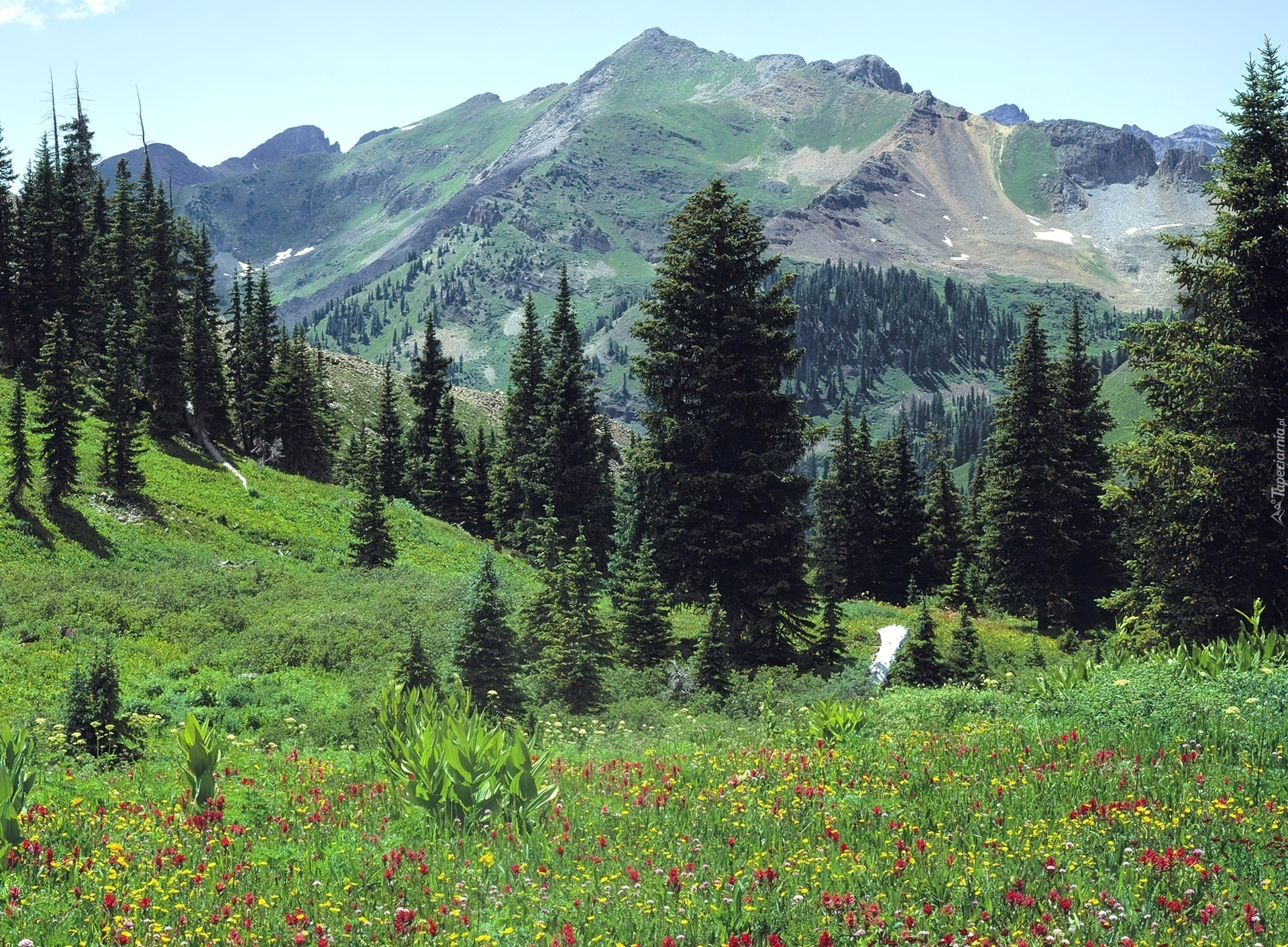 Edytor tapety: Góry, Drzewa, Kwiatki