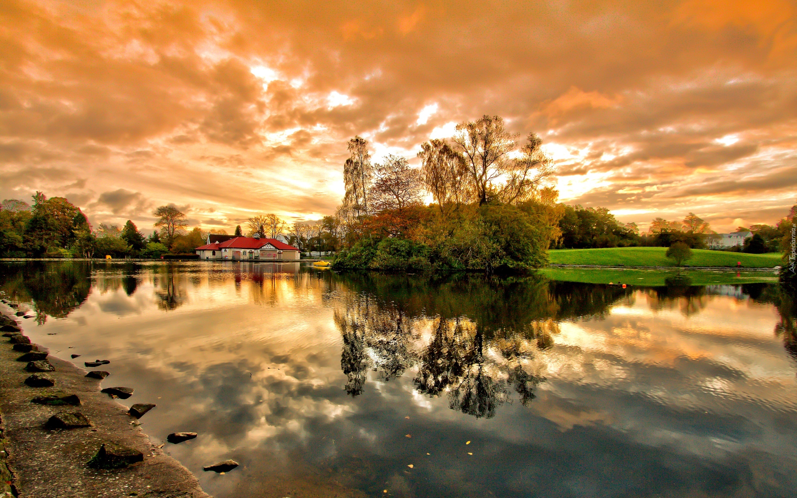 Edytor tapety: Jezioro, Chmury, Drzewa, Dom